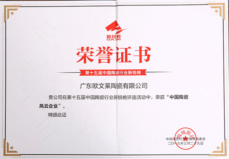 欧文莱作为中国瓷砖品牌,坚守原创设计,坚持产品持续创新,持续推动民族品牌的国际化进程。2018年以来,欧文莱是代表中国参加意大利博洛尼亚展CERSAIE的素色瓷砖品牌;2020年,欧文莱成为入选央视《崛起中国》栏目的高端瓷砖品牌,代表中国创造先进水平与特邀主持人水均益高端对话。
