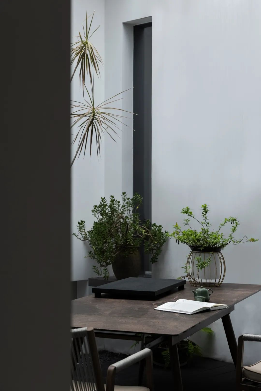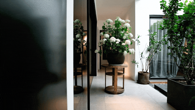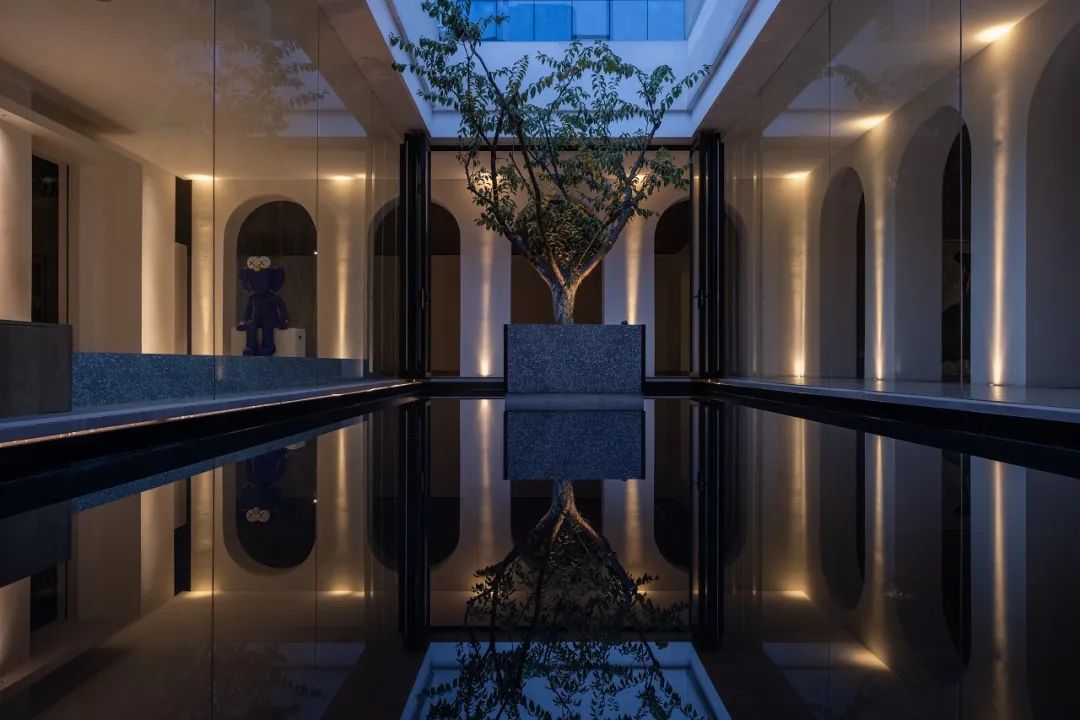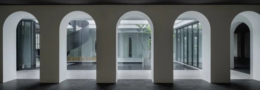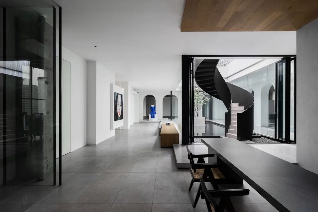 与很多公司传统的进门设计不同,整个空间的设计是随性的,去前台化的,没有太多的条条框框,让思路自然打开。设计师表示,首先穿过画廊,抵达区间前的路途,采用了先抑后扬的手法。这样一个相对安静的空间,是经由身体至心理的前奏铺垫,在过程中去欣赏和了解新成对设计的理解,然后穿透到一个打开的状态,豁然开朗,像桃花源记一样。陶渊明的《桃花源记》,借武陵渔人行踪这一线索,把现实和理想境界联系起来,为世人创造了一个世外桃源的想象。芳草鲜美,落英缤纷,阡陌交通,鸡犬相闻。快节奏的现代社会生活,每个人都急匆匆的在往前奔忙,驻足美景、流连趣事越来越成为人们生活里不可或缺的精神养分。时至今日,桃花源的意义不只是一个标签性很强的概念、一个理想化的图腾,寻找桃花源,寻找的,是在快节奏生活状态下,一个暂得喘息的理想出口,是理想生活的肇始与初心。一缕清风,几片闲云,还有绿植散发出的大自然清冽悠香,颇有一种“久在樊笼里,复得返自然”的豁然。沿着廊道向前走,艺术画作的设置让空间处于一种悬浮状态,既简单又不呆板,一些盒子状的穿插结构,拾级而上,感觉更灵活灵动。视线中的艺术楼梯,拾级而上,则可抵达二层的园林。存在于整个空间当中,它像一件艺术品,亦给人以上下的尺度感。铺设廊道的是欧文莱“灰印象”系列瓷砖(点击跳转介绍),在光线映衬下展现出丰富的层次感和自然肌纹,化繁为简,以刚驭柔,为整个场所平添几分气度与生命力度。“灰印象”还原自然石材的质感状态,肌肤与砖之间的温润度,更好还原设计理念的简约肌理,亦成为了它被青睐与选择的原因。“素色能融入到整个空间里面来,能更好地表达设计作品本身,而不是砖本身。我们选择材质的时候用的是基本是素色和木色,因为想让自然的东西带到我们的生活中来。欧文莱的素色砖的特点就是质感非常好,和大自然能融为一体,给人以包容感。”“我们选择的砖以及设计空间的所有材质,它们未来都是一个整体,而不是某一个单独的东西跳脱出来,它不应该这样传递。‘灰印象’表面凹凸的小肌理,像极了雨后小路,它更好地把外面的水景和自然融合到了一起。”夕阳渐昏的光线将整个空间包裹,华灯初上,氛围阔朗而静谧。“好的设计没有太多的形式化,欧文莱(素色砖)的灰度可以让我们在不同空间,不同场景去表达不同的光感感受,阴影感受,以及光和空间怎么做一个更好的结合,生动的状态。”四边廊道围合出一方天地,设计师将中国传统四合院和古罗马斗兽场拱形元素等西化造型相结合,希望达到一种巧妙的衔接,产生一种东西方的融合之美。放眼可见,中古的金箔屏风、经典的昌迪加尔椅、当代的极简柜体等不同时期的元素进行和谐对话,具有人文色彩的素色瓷砖、时尚感的大理石及玻璃材质、石竹等元素的混搭,通过光线调教,构筑属于现代人的意象之居。作为接待室的空间,也作为平时朋友相聚的场所,融入了设计师对生活方式的理解。参考中国的四水归堂设计理念,空间布置得紧凑,而又自然连通。各个空间各具艺术感染力,在花叶漫漫中自成焦点,却又与周遭一切脉韵连贯,相得益彰。四季草木,郁郁葱葱,仿佛信手拈来的诗情画意,却对空间进行了巧妙而合理地划分,保证各部分独立性的同时去除疏离与突兀,使空间叙事具有连贯性及整体性。设计师希望,一切都是回归到自然里面的。整个空间材质以素色、木色为主色调,以框景手法,将自然之景引入空间之中,虚实结合,移步换景,借景造景,将室外和室内形成无缝的链接,营造一种回味悠长的意境之美。都市喧嚣隐匿在桃花源般的宁静和美中,此情此景,人与空间情感交融。啜饮谈天,偷得浮生半日闲,这是一种温和的、潜移默化的促成。每个区间有各自不同的尺度和性格,但殊途同归,可见的是设计师对空间设计的理解,以及在人文生活情境上的打磨。新成空间艺术成立于2007年,是一家专注于高端私宅设计研究与实践的事务所,致力于引领东方现代居住审美,平衡精致的美感与生活方式的魅力,提倡无风格设计。通过研究空间与人的关系与感受,构建当下人对空间的物质与精神的感受。