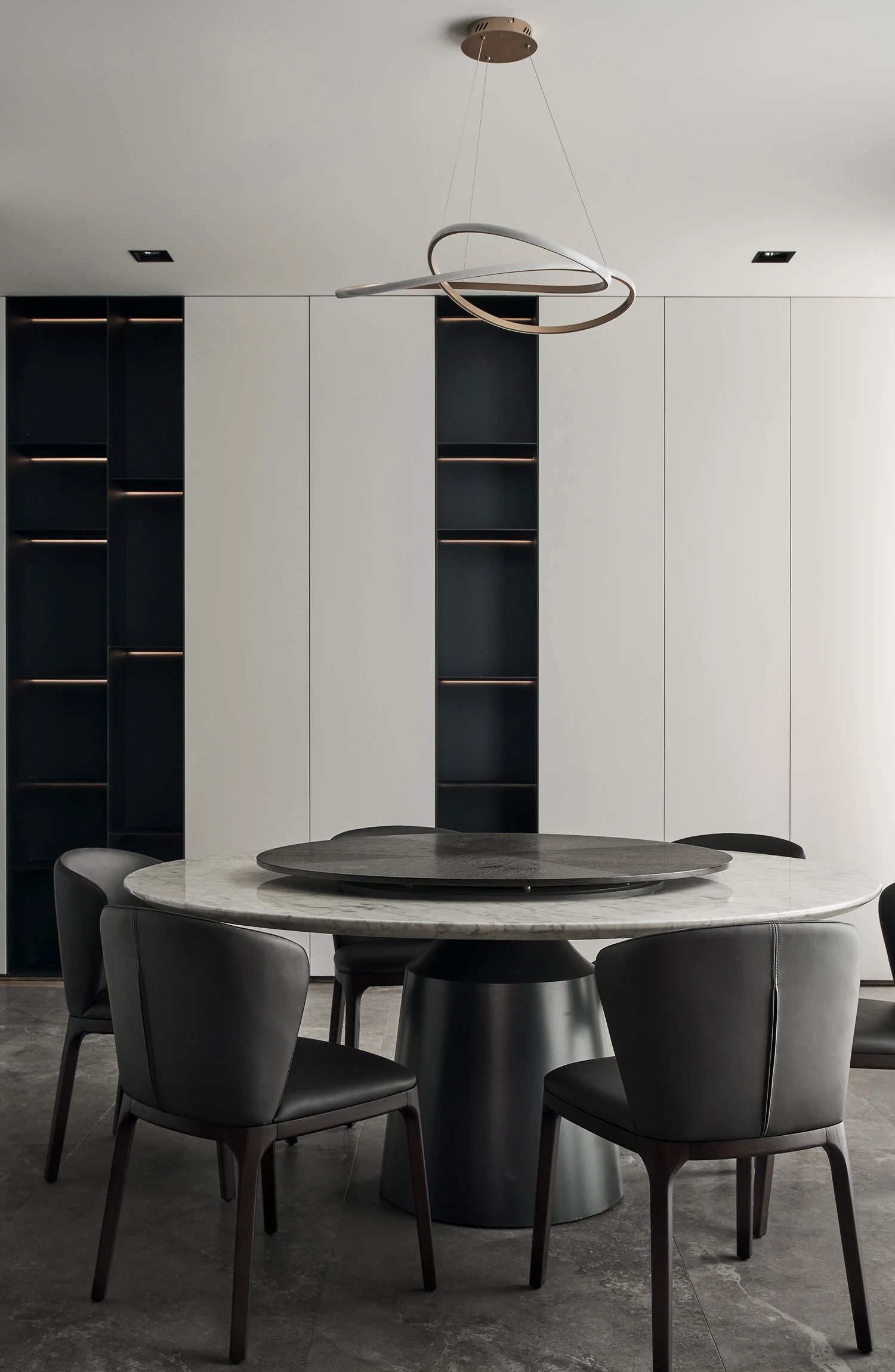 黑白灰在餐厅中流转,配合打造了无处不在的精致感,自然而然地渲染颇具格调的生活场景。造型吊灯增添了一丝现代感与时尚气息,与圆桌呼应,赋予空间沉稳硬朗之外的温柔。