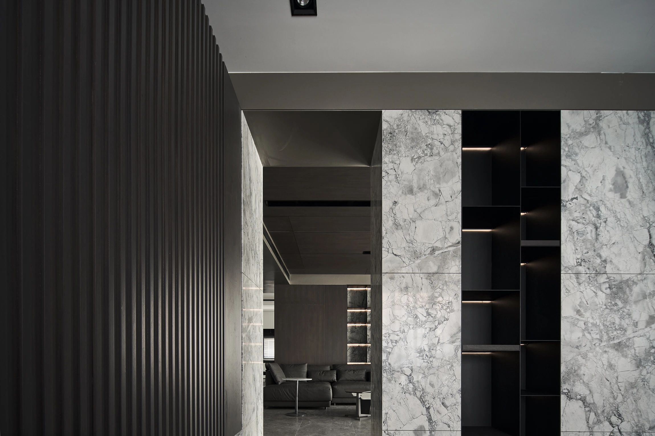 沉稳而内敛的视觉观感散布于每一个细节之中,墙、地不同的理石纹理赋予空间些许流动感,赋予空间感染力。