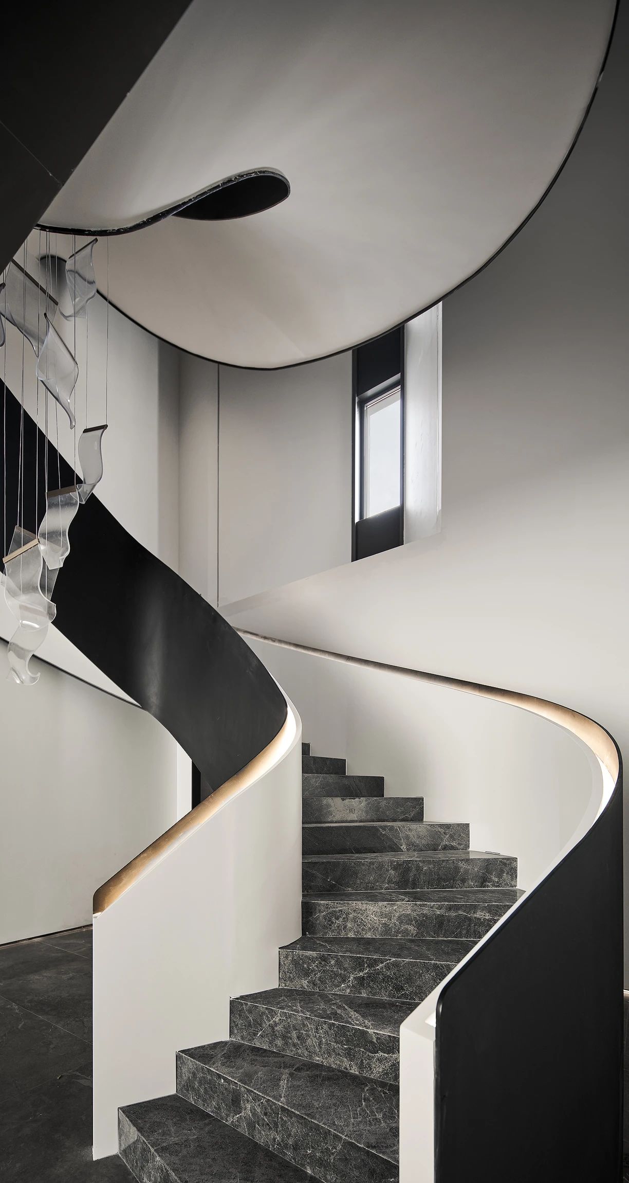 楼梯作为贯穿上下层的载体,在这里具有相当的艺术性和功能性,张扬大气的理石纹理打破极简黑白的沉闷,游龙般的蜿蜒简洁而不失优雅。视角随上下行进而转换,不同角度皆有趣味之美。