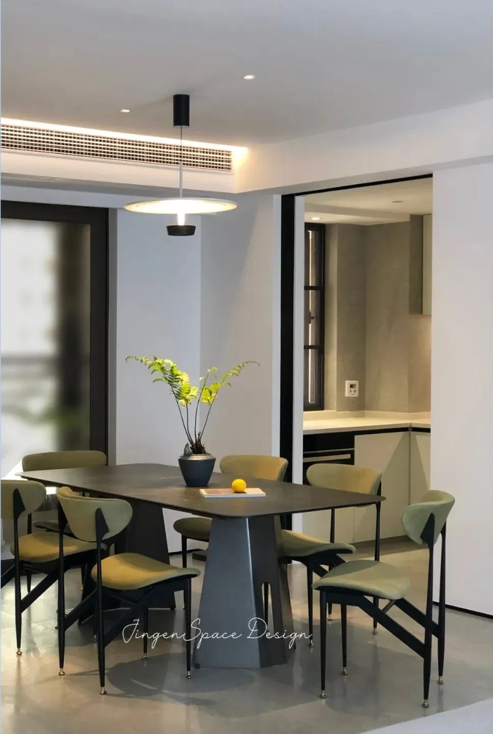 黑色餐桌仿佛与客厅茶几相互呼应,凭借着简约时尚的风格、精秀外形和优雅配色,餐桌可赋予整个餐厅不仅实用,还有丰富的可观赏性。简洁统一的用色搭配为空间整体带来了更多的张力,黑色、灰色、绿色让整个空间在色彩上有了一定的对比,同时悬挂的吊灯又增加空间当中的艺术感,让空间氛围变得更加宁静舒适。厨房与餐厅相互衔接,选用了白色主调的柜体搭配灰调空间,“高级灰4.0”柔和的肌理凸显了空间整体的细腻质感。-