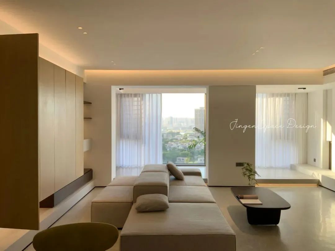 空间中不同的材质在明度不一的低饱和素色搭配下相互呼应,丰富了空间层次,加上当中的细节,营造了精致高级的空间氛围。