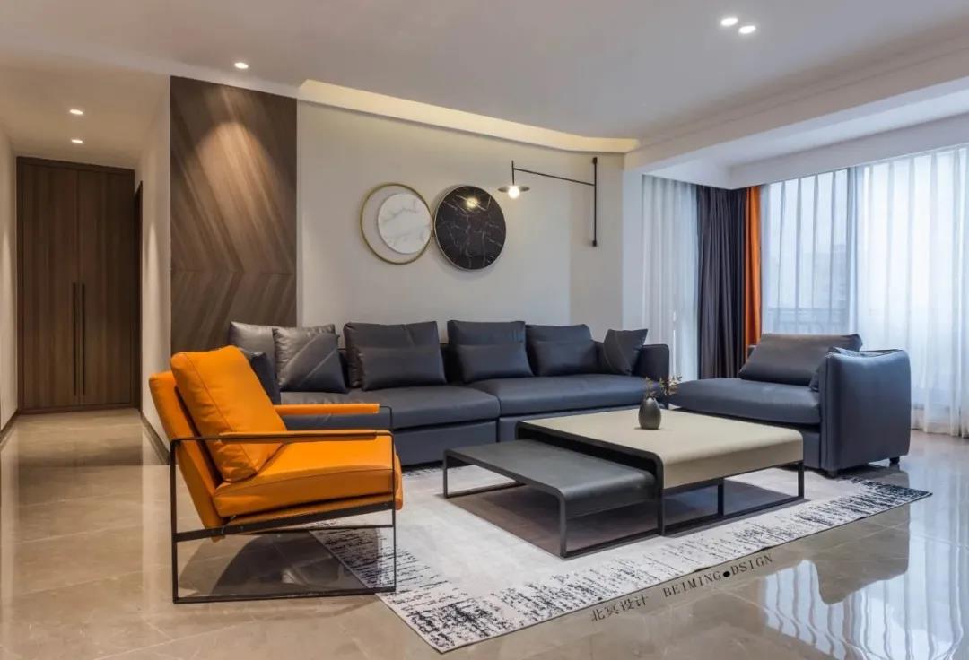 在色彩搭配方面以素色为主,地面大面积铺贴“欧文莱灰”,素雅大方,包容和谐;另以橙色等亮色进行点亮,带着淡淡的随意,让人感受到空间弥漫的温馨与舒畅。