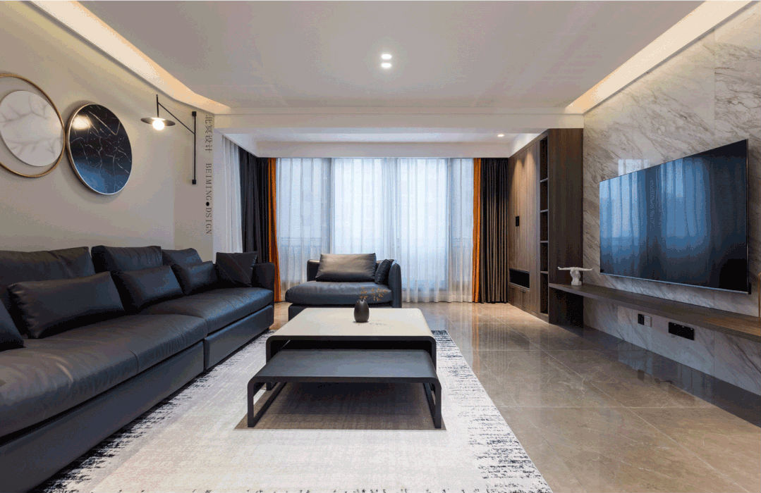 电视背景墙使用经典的大理石纹,与“欧文莱灰”相得益彰,更显质感。