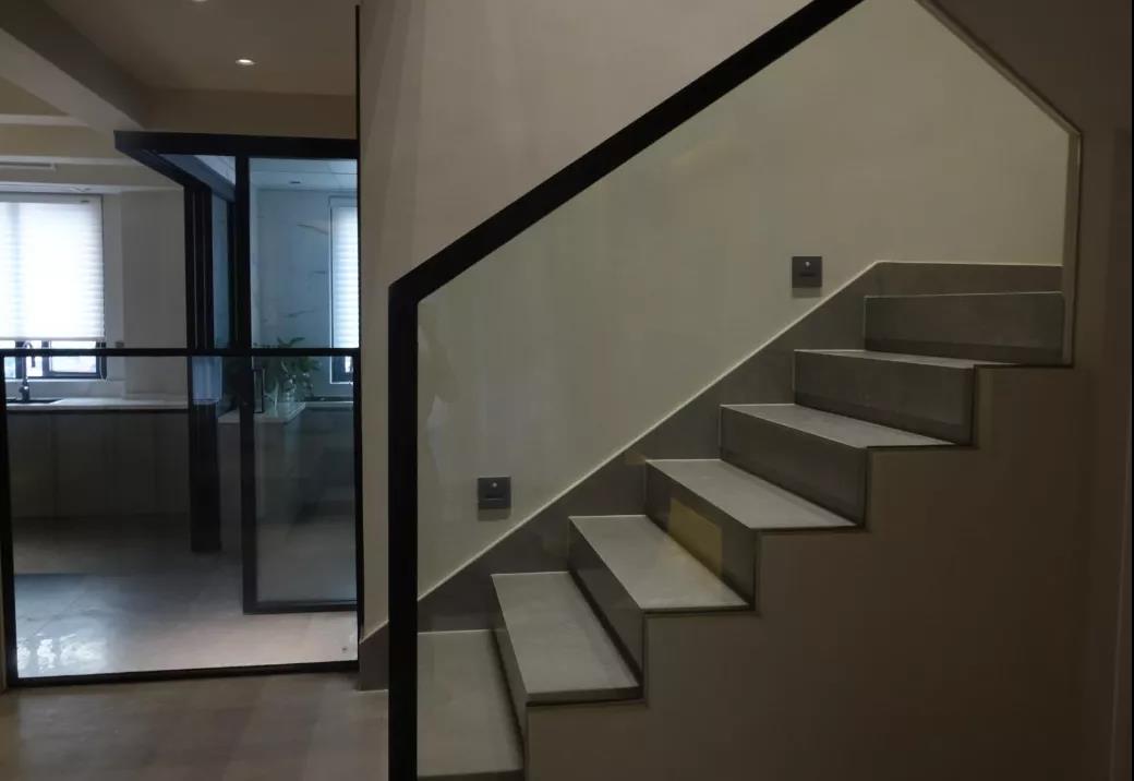 楼梯同样应用的是“量子灰”系列,素色人文暖灰定调现代家居背景,将时间打磨出来材质色彩真实还原,清新中显温暖。