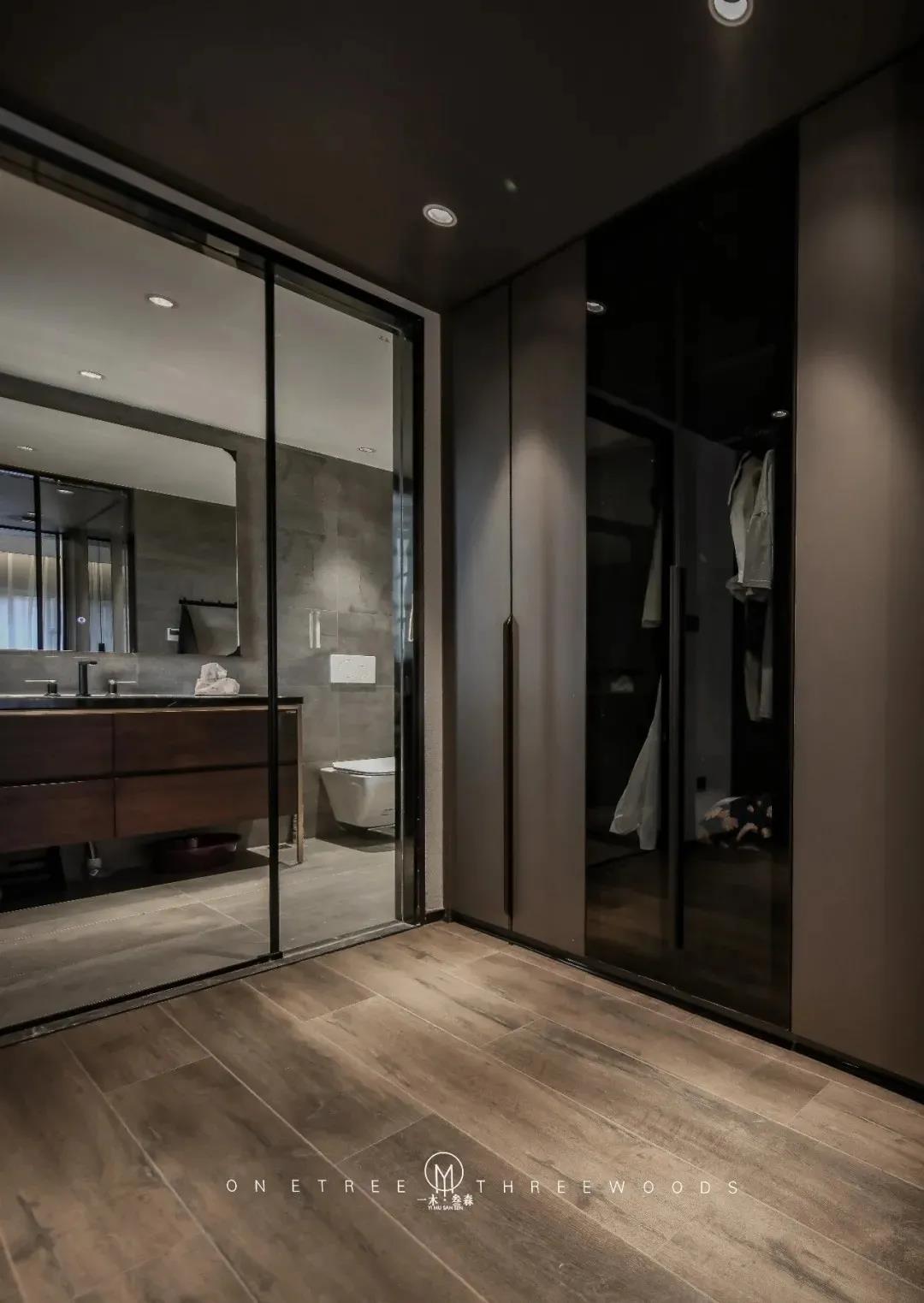 考虑到应用场景的连贯性,整个家的设计在用色、材质上的选用皆有相互的呼应。床品区与更衣室的相互空间交流,凸显人居文化的品质感。