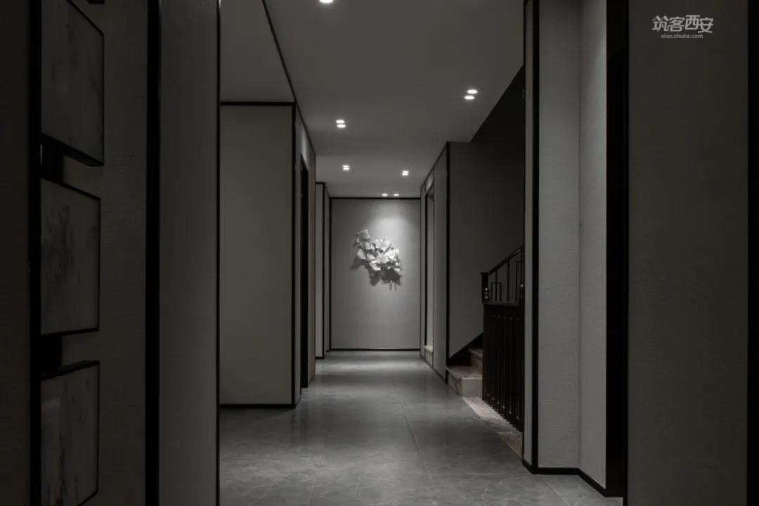 拾阶而上,黑色的条框收了所有的棱角,瓦的元素材料让廊间自然之下,层层错落的吊顶,承载了廊间的灯光强弱,让平凡无奇的走廊,也成为家里的设计亮点。