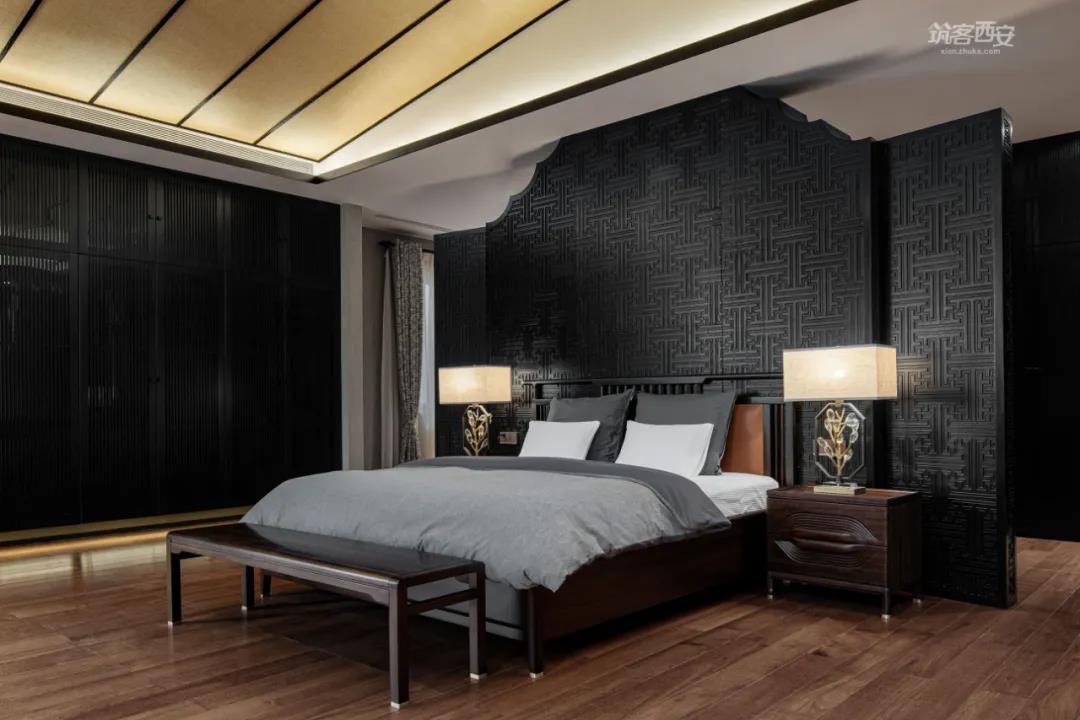 屏风的定制设计,依托了主卧的背景墙,亦营造了主卧的中式意境;书香扉页的坡顶设计,黑色紧密的现代四隔扇门,保证了私密和隔音效果;主卧区域半遮面,得一日安眠。