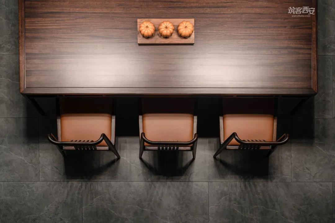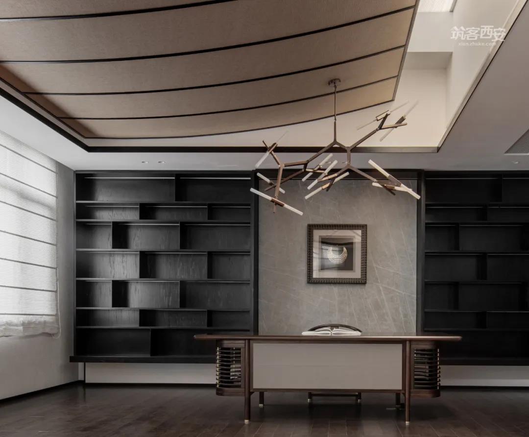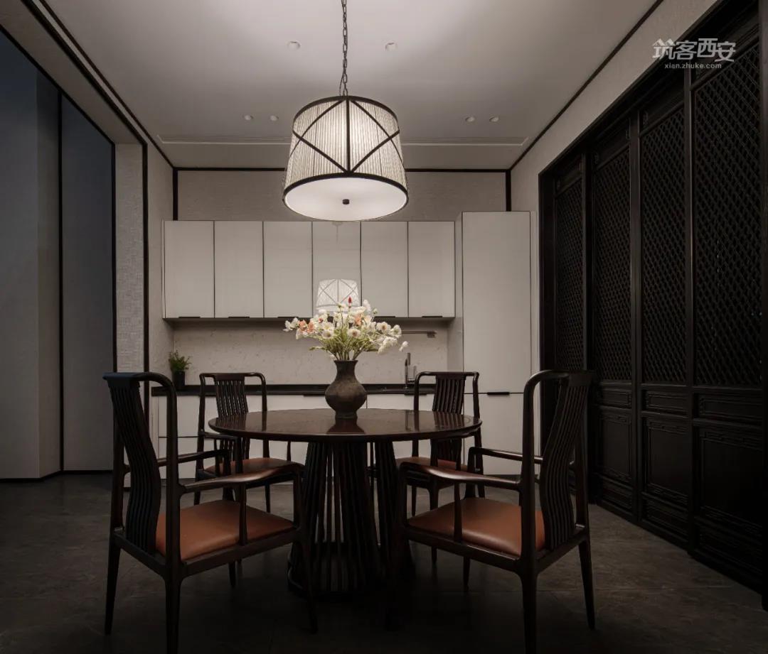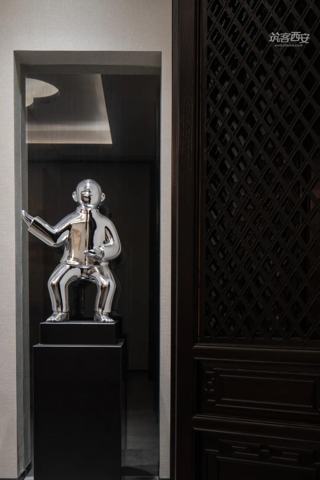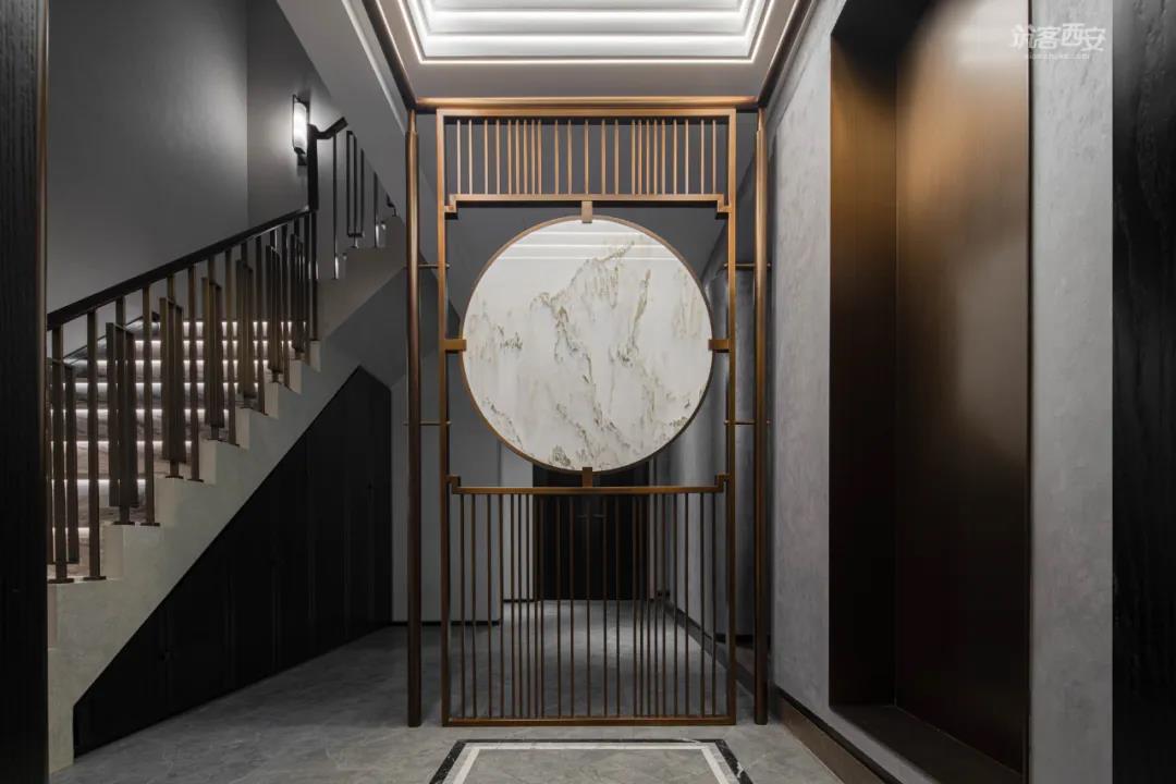 设计师从顶面、墙面的互动关系设计上,将新中式的传统美与现代感营造出“心灵状态”,金属铜的质感贵气,高贵黑色纂花木纹,空间情绪从设计细节氤氲而出。