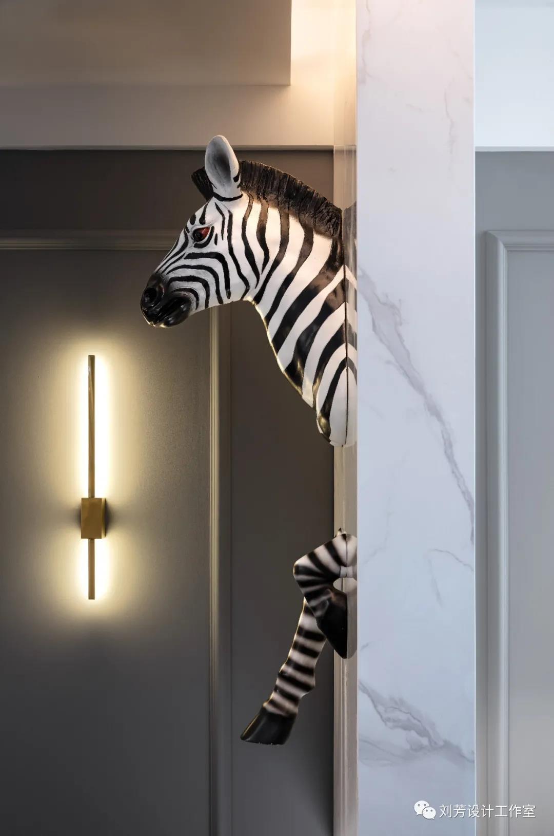 在进门客厅隔断墙面上选了一个脱缰而出的斑马挂件,给原本生硬的石材墙面带来一些视觉冲击。