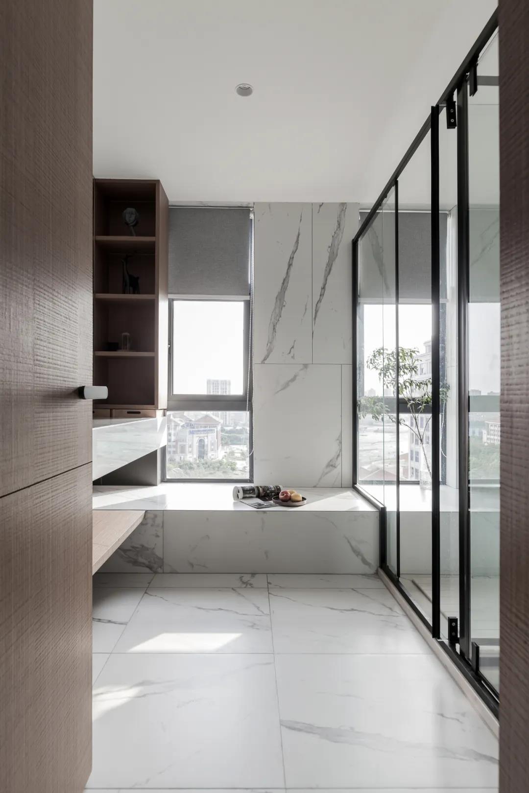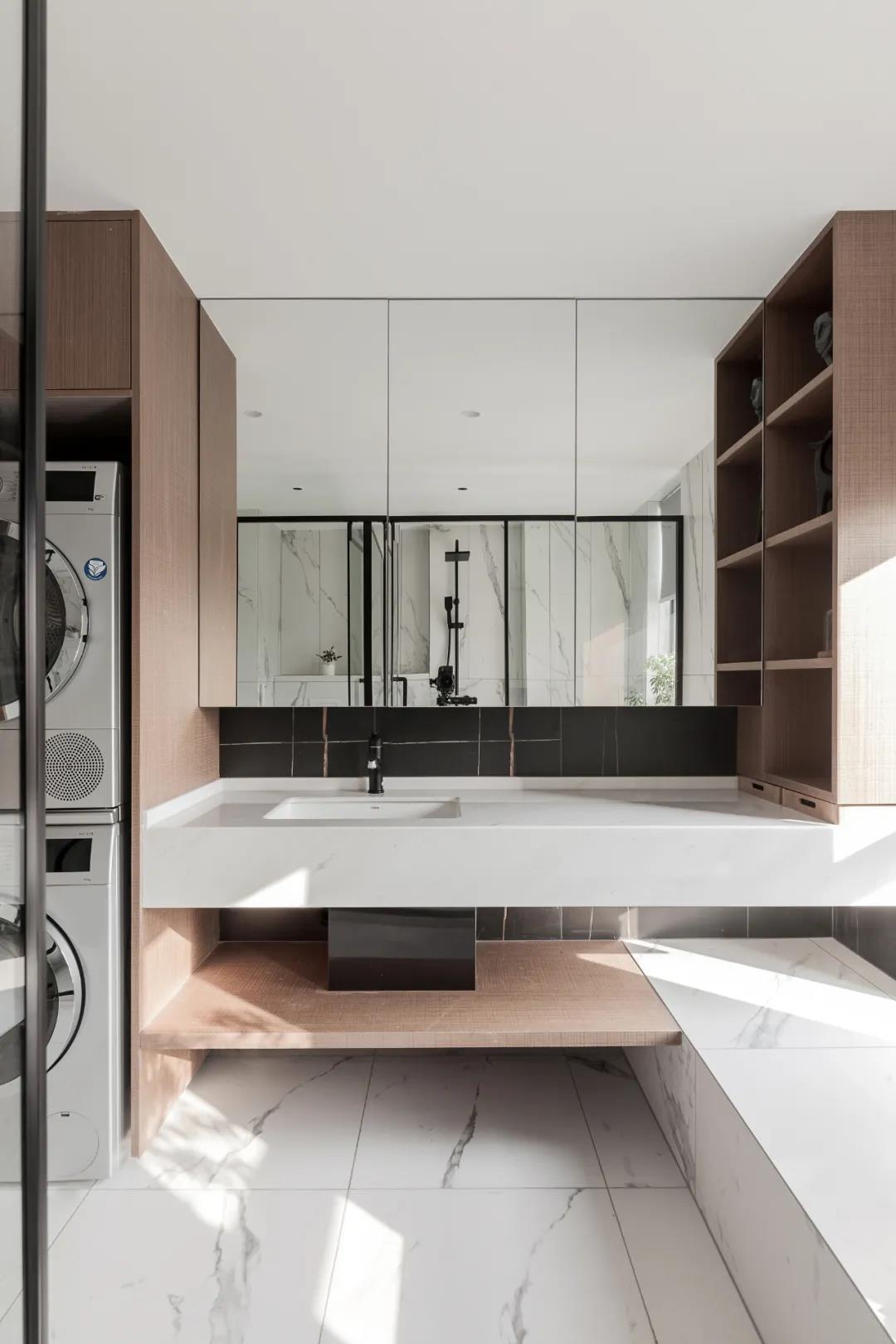 延续客厅设计的木质柜体充满质感,增加空间辨识度。“卡拉拉”系列灵动轻盈的白色,同样让卫生间看起来更加通透,一切都安静且美好。