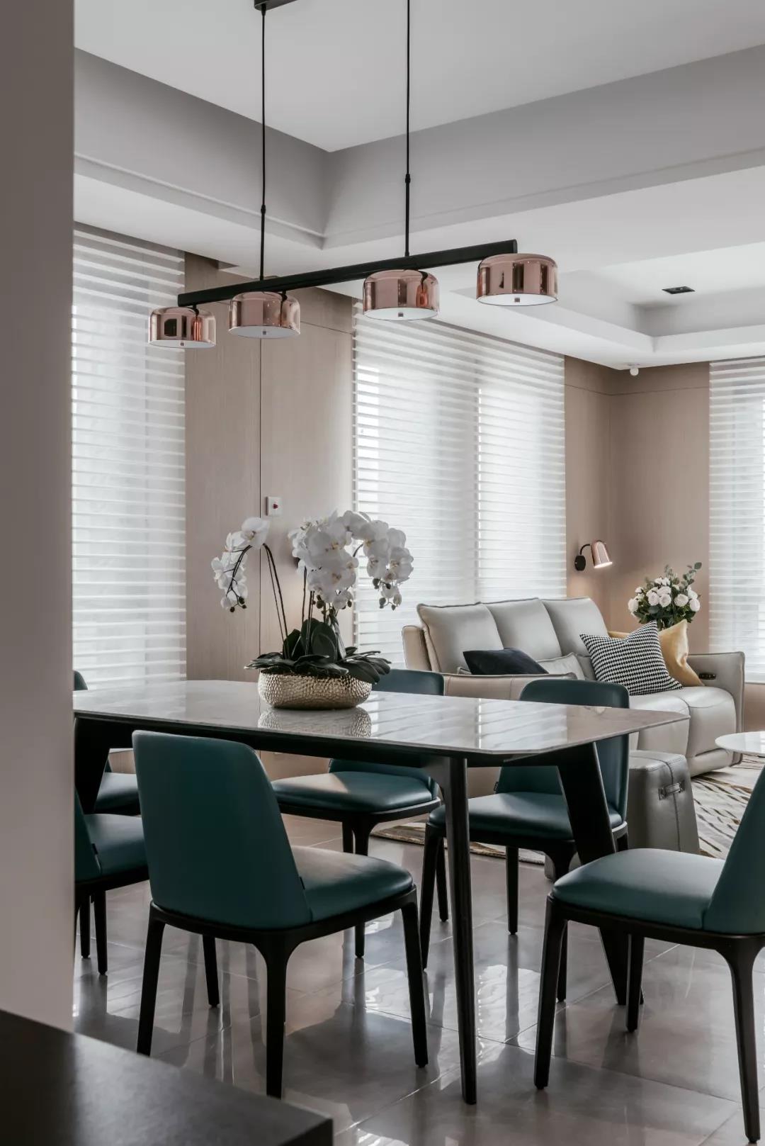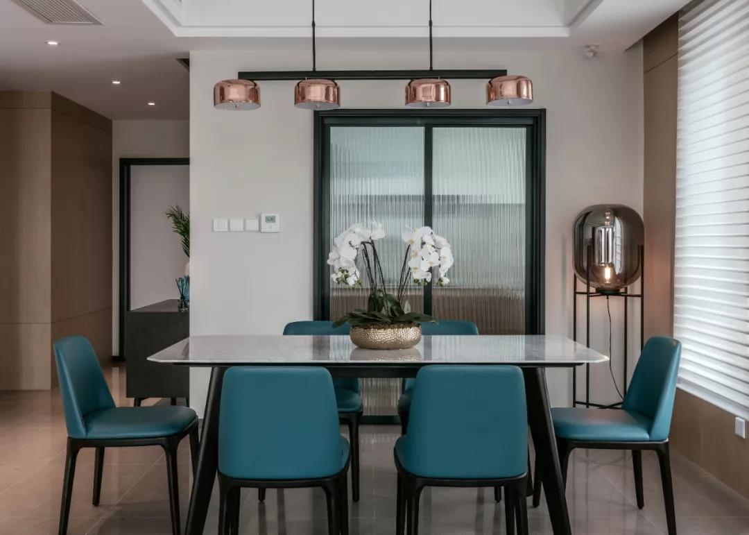 作为家人们一起吃饭、闲聊家常的地方,餐厅在人们的情感交流上起着举足轻重的作用。蓝色的皮质座椅在浅淡的色彩中脱颖而出,几盏金色吊灯呈现的是精致的生活态度,暖色的灯光则是营造温馨的视感,让人倍感温暖。