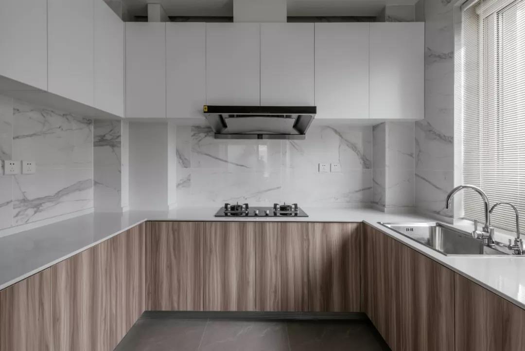 由下及上,灰-原木-白色的颜色层次,在视觉上维持了一贯的清浅。但平行的原木肌理和散漫的“卡拉拉”表面纹理,让厨房在纹理和材质上有了丰富的层次。明亮干净的灶台带来舒适的视觉感受。