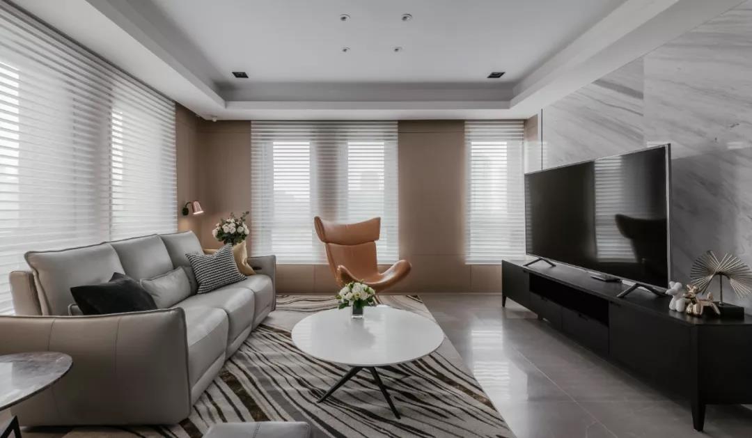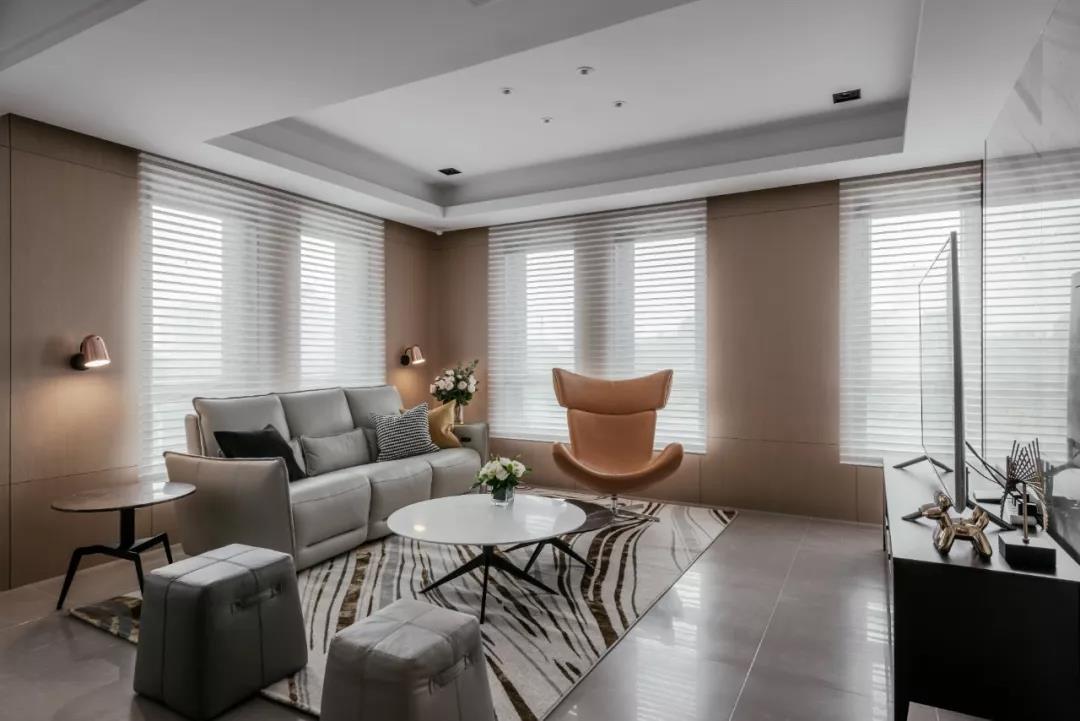 客厅作为活动的公共区域,减少小件家具的数量,保持了一个简洁的空间环境。通过增大采光的面积将自然光引入室内,在材质上摈弃了厚重的遮光窗帘,而是使用白色的百叶片,轻盈感与明亮感呼之欲出。