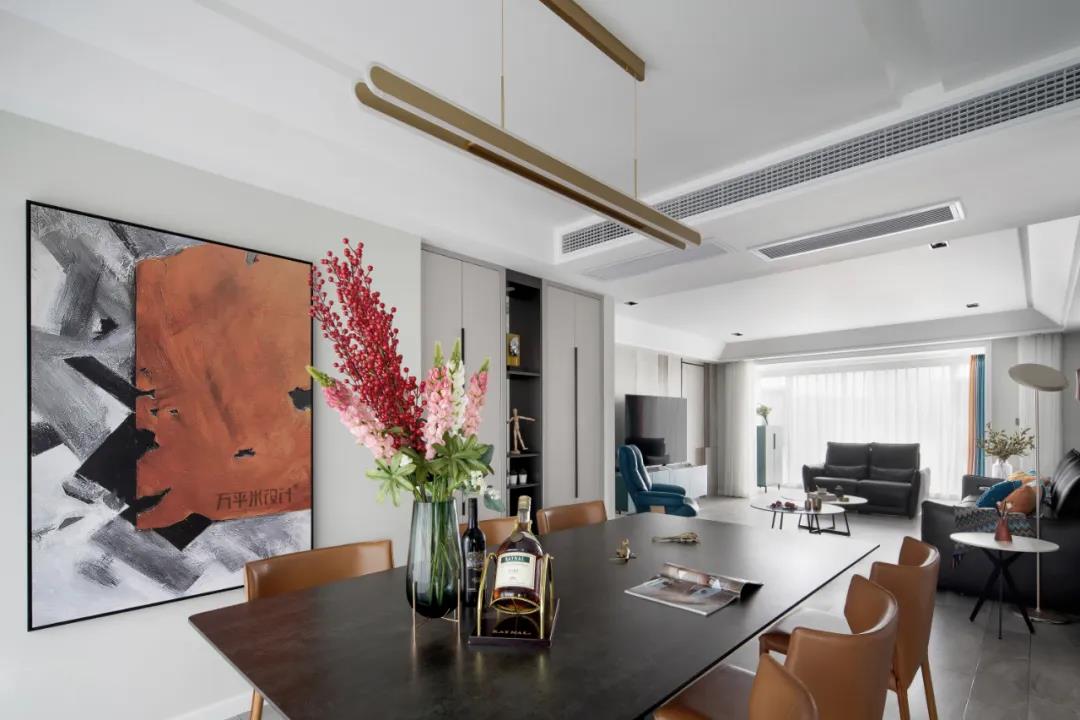 餐厅面积依托玄关墙得以扩展,延展毫不设限的生活尺度,宽大的餐桌因此游刃有余,足以容纳亲朋好友聚餐的需求。
