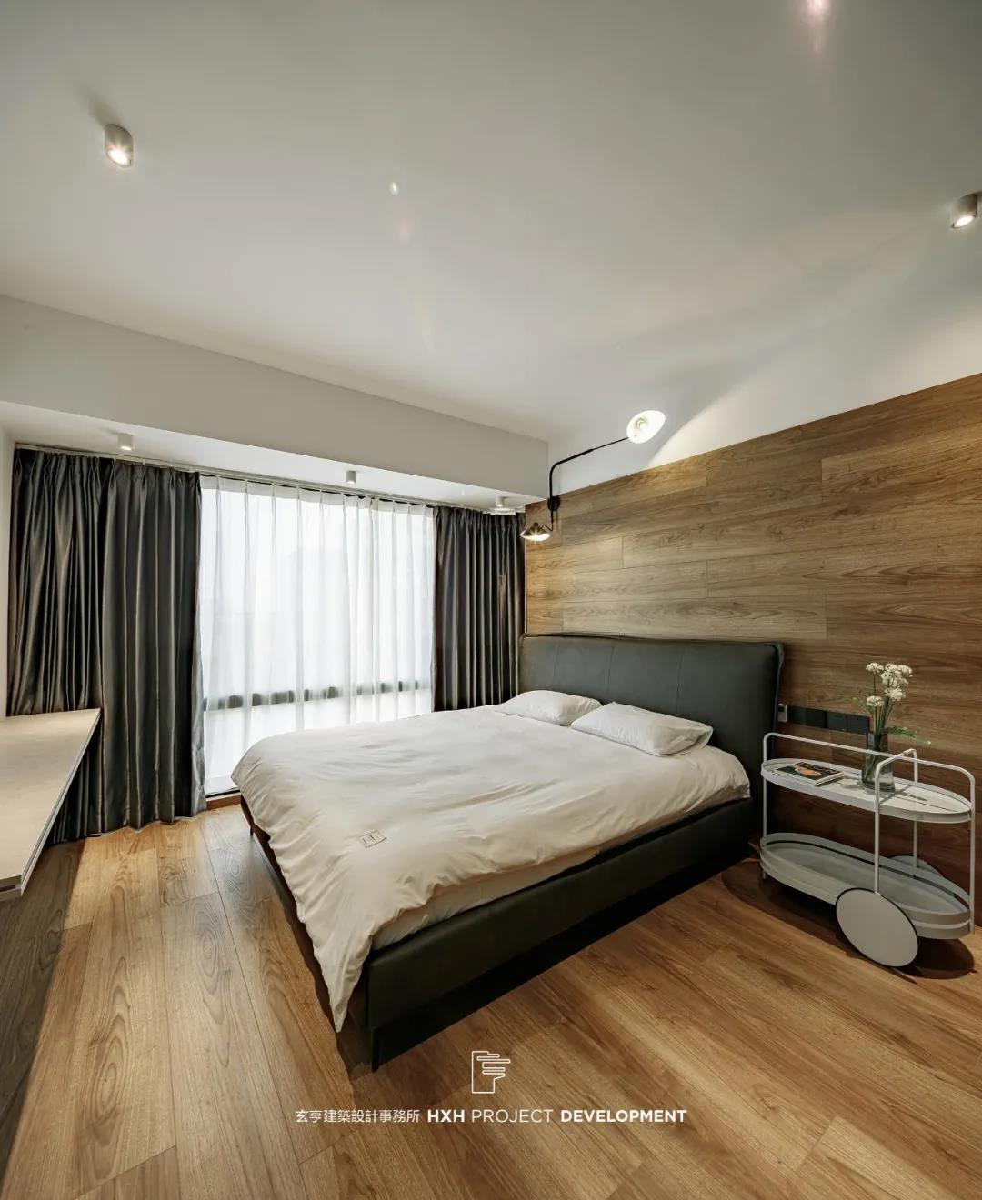 卧室墙面与地面同款材质,在视觉上将空间扩大,木纹提升了整个空间静谧平和的感受。