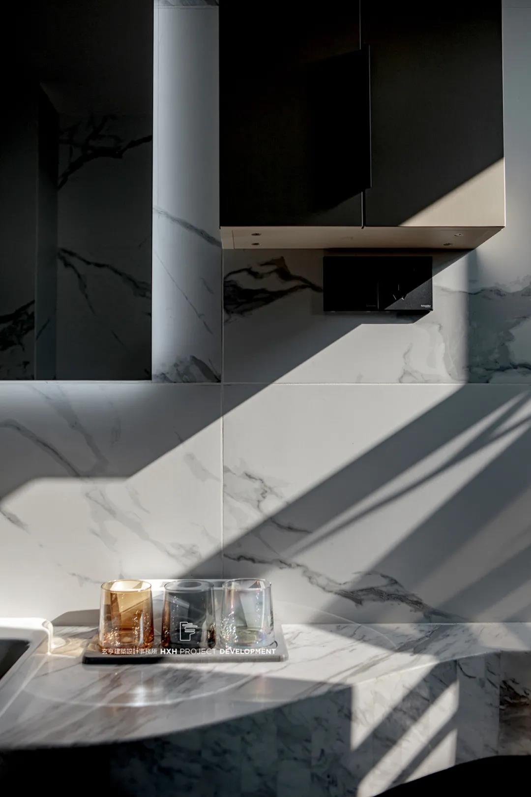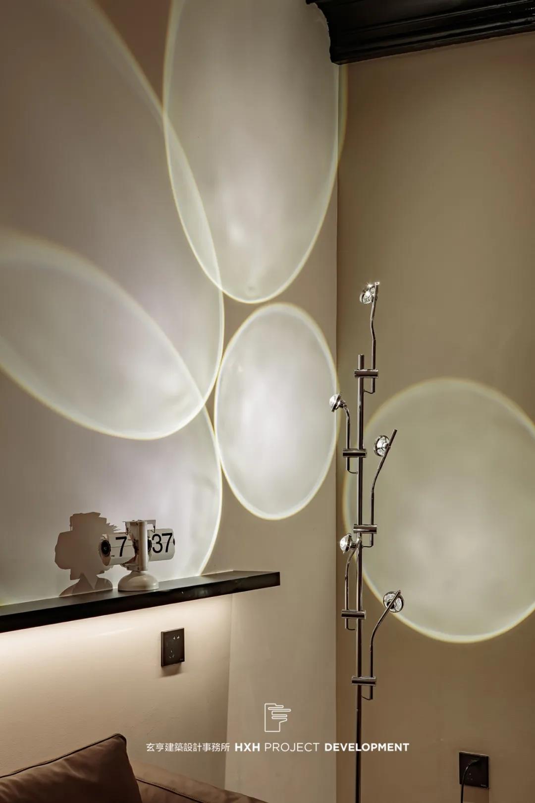 自然光的引入、橘光片羽般倾洒、又或是创意灯饰投在墙上的身姿,本案应用不同的光景,在空间中穿插、层叠,与素色瓷砖串联起一个个幸福的生活瞬间。