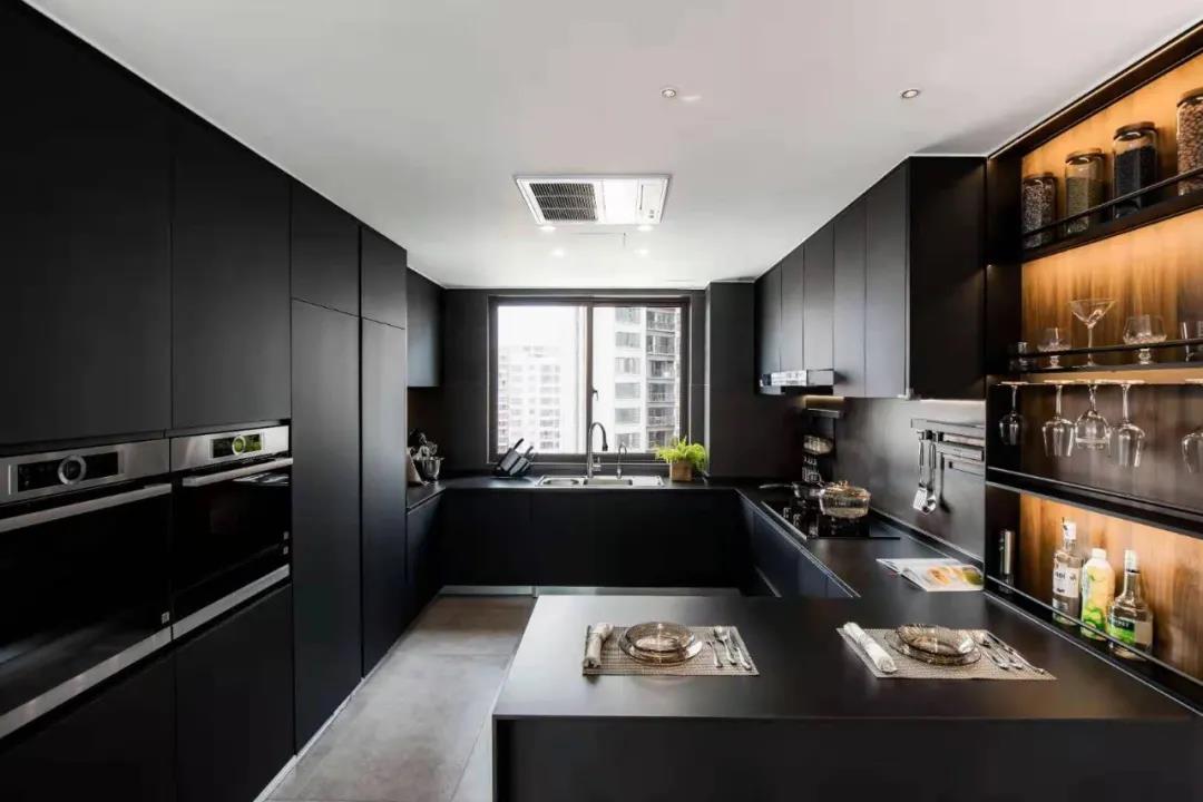 厨房延续整体主调性,将简约的手法与高级的色调融合,十分“有性格”——深色的柜体色调保持了整洁的统一性,营造出空间的深邃和高级感,彰显时尚个性。
