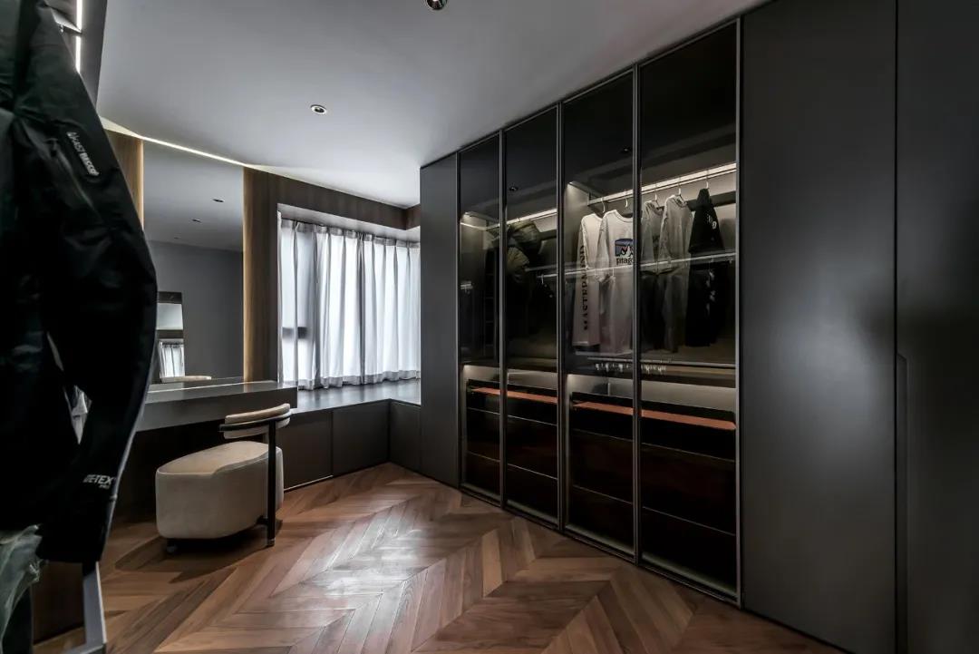 在私人空间营造上,结合另外两间卧室以及两个卫生间,划分出业主的休息空间以及步入式衣帽间空间,再把现有两个卫生间整合成一个干湿分离的卫生间。