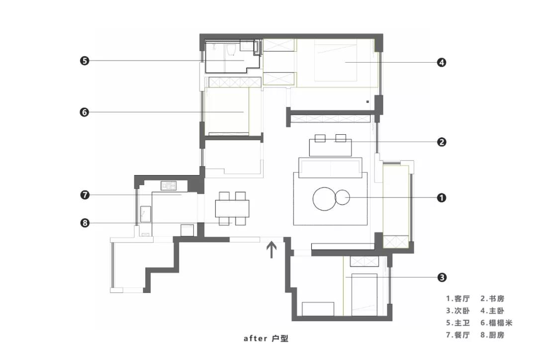 客厅和书房空间进行合并,保持对话同时又相互独立。设计师介绍,业主喜欢观影,所以在客厅使用投影来代替电视,阳台的双层窗帘有效改善室内的光线环境,来提升观影体验。