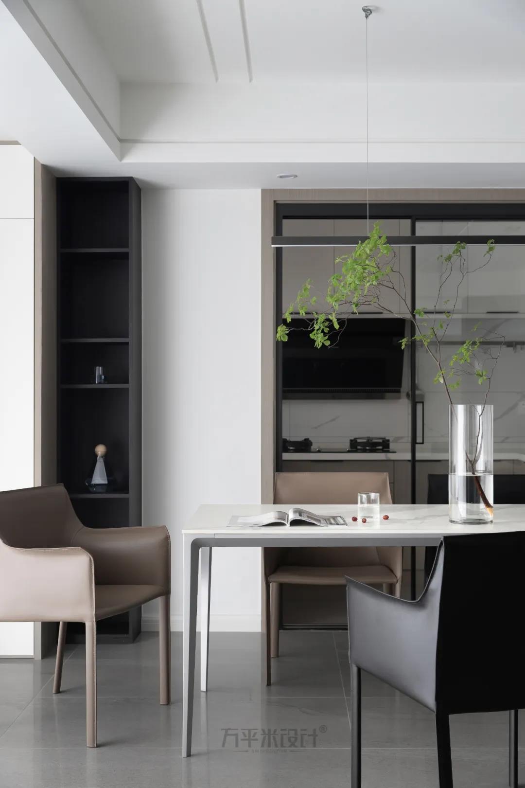不同深浅的餐椅,交错放置在餐桌的两侧,呈现出"和而不同"的丰富空间感。