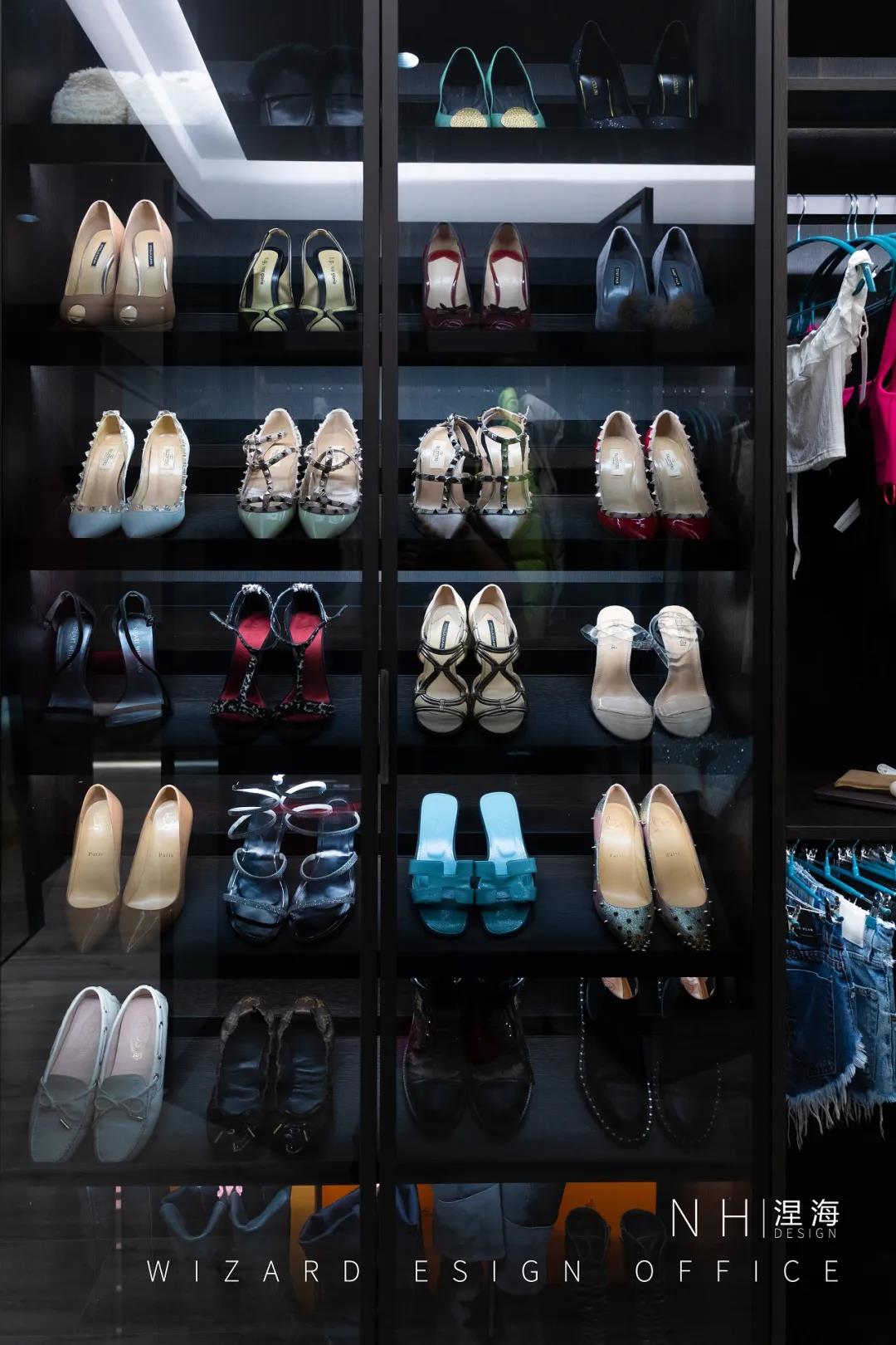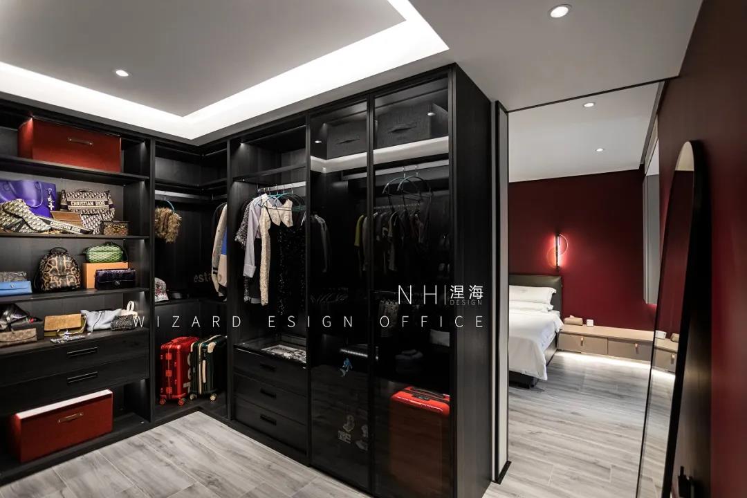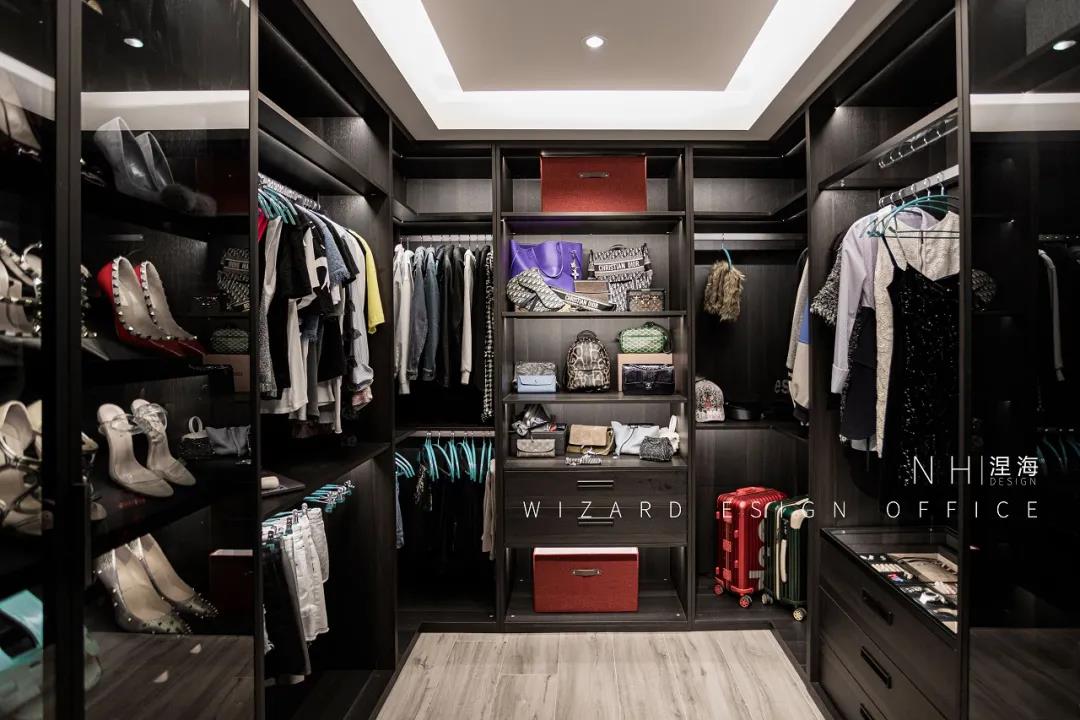 一个足够容纳主人后宫佳丽的衣帽间,柜体运用了黑色木饰面与黑色不锈钢搭配,简洁大气,储物空间大,有效分类存放鞋类及悬挂日常衣物等,巧妙定制彰显精致生活。