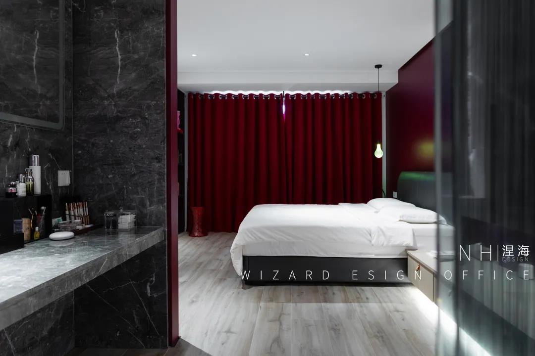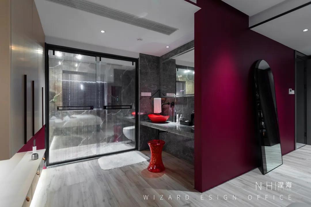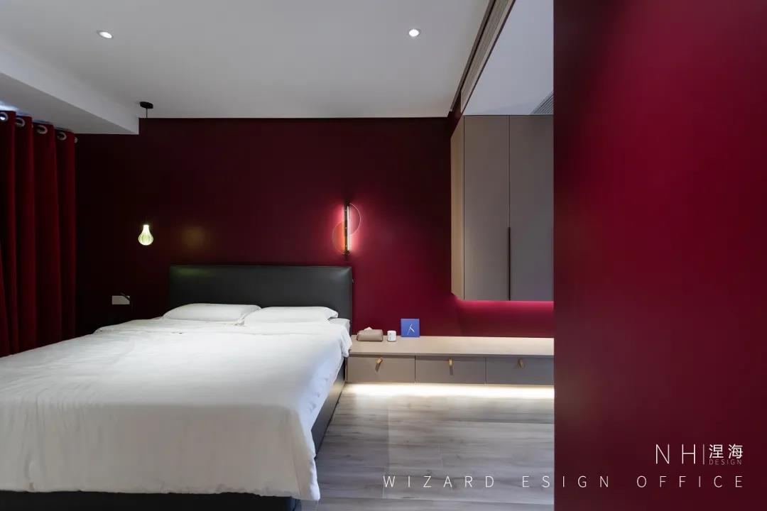 深色的柜体与卧室红色墙体形成强烈的视觉效果,地面大面积铺贴无印良木系列,柔和的色泽缓解了眼部的紧张,以自然的态度包容一切,放松灵魂。
