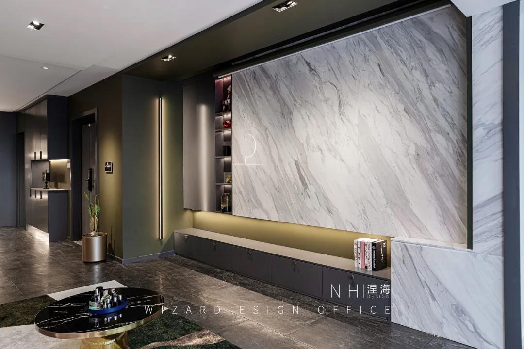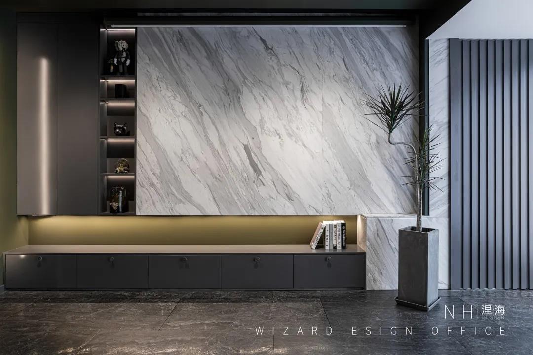 地面选用哈瓦那系列,以高雅的深灰色调为基础,搭配局部白色石材,深与浅的对比下,烘托对空间轻奢时尚的幻想,提升整体颜值。
