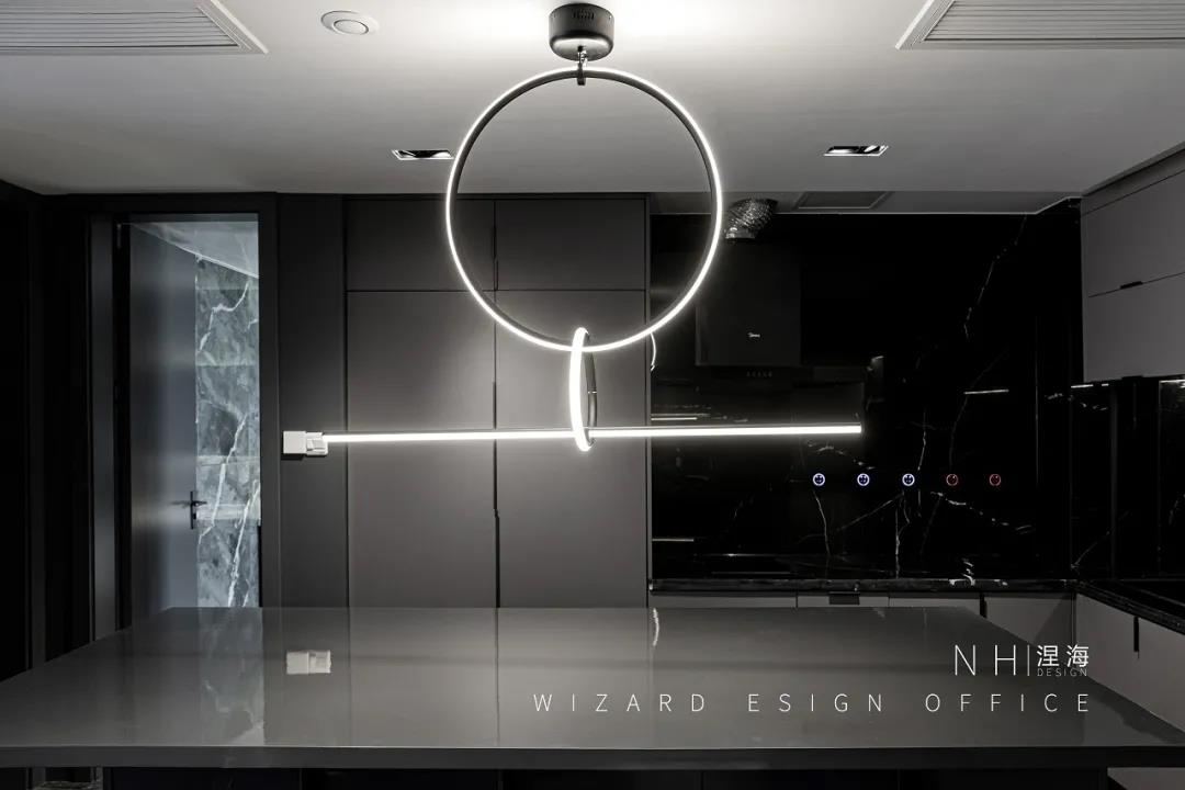 开放式厨房,个性吊灯散发着情调的光影,适合与朋友小聚,顺便再开一瓶红酒的那种。