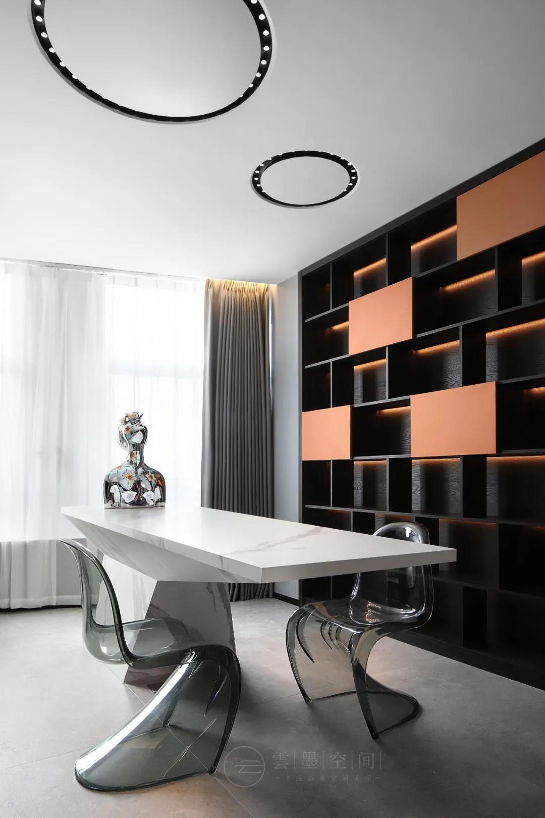因此,空间以黑、灰等能令人心情平静放松的素色为主色调,饱和度高的红、橙、蓝以色块、软装等形式点亮设计,于简约中,透露现代时尚。展现空间与人的对话,赋予空间更多遐想。