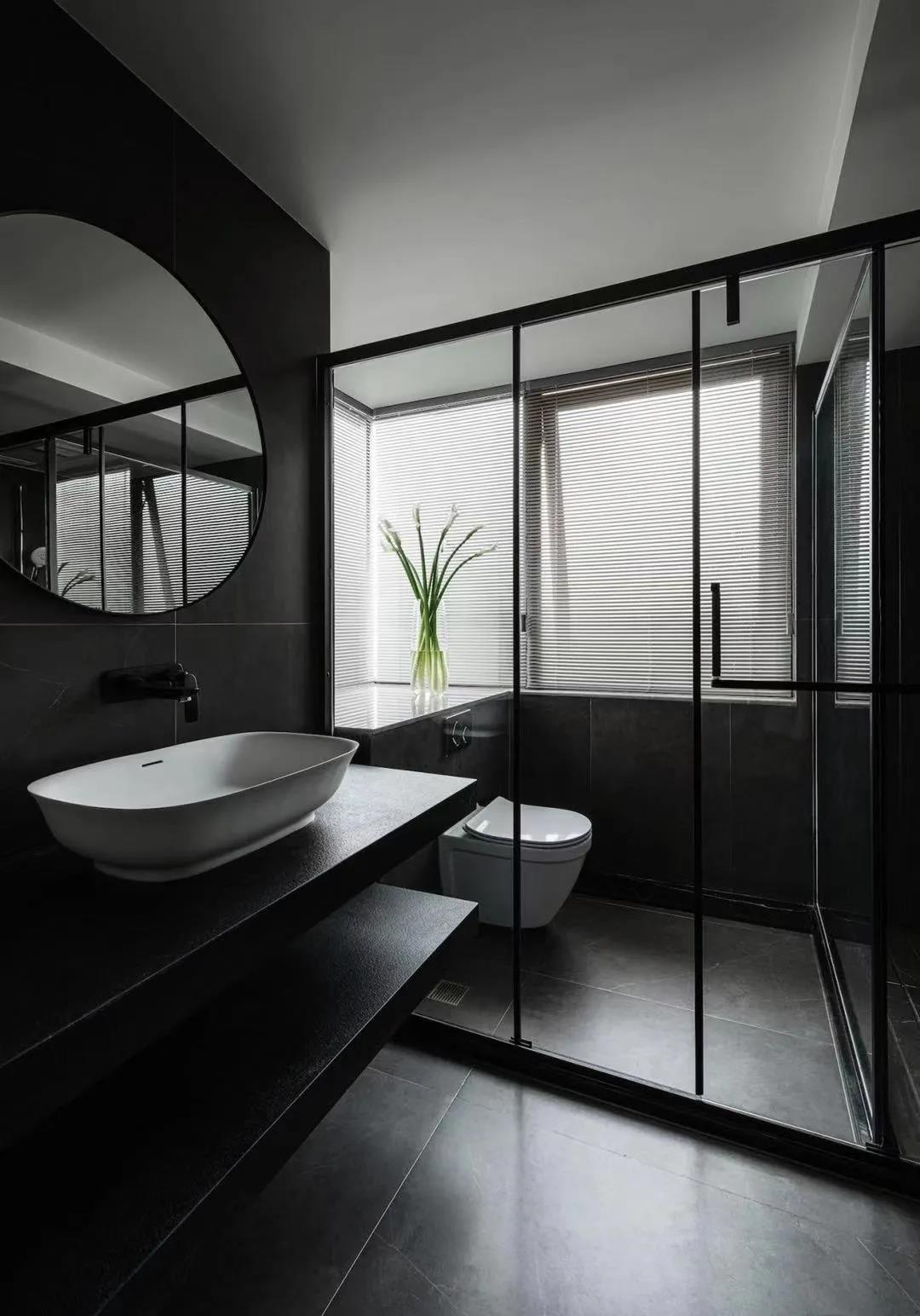 卫生间以深灰色为主基调,简洁的线条感与沉静的空间配色,突出现代风格的独特美感。