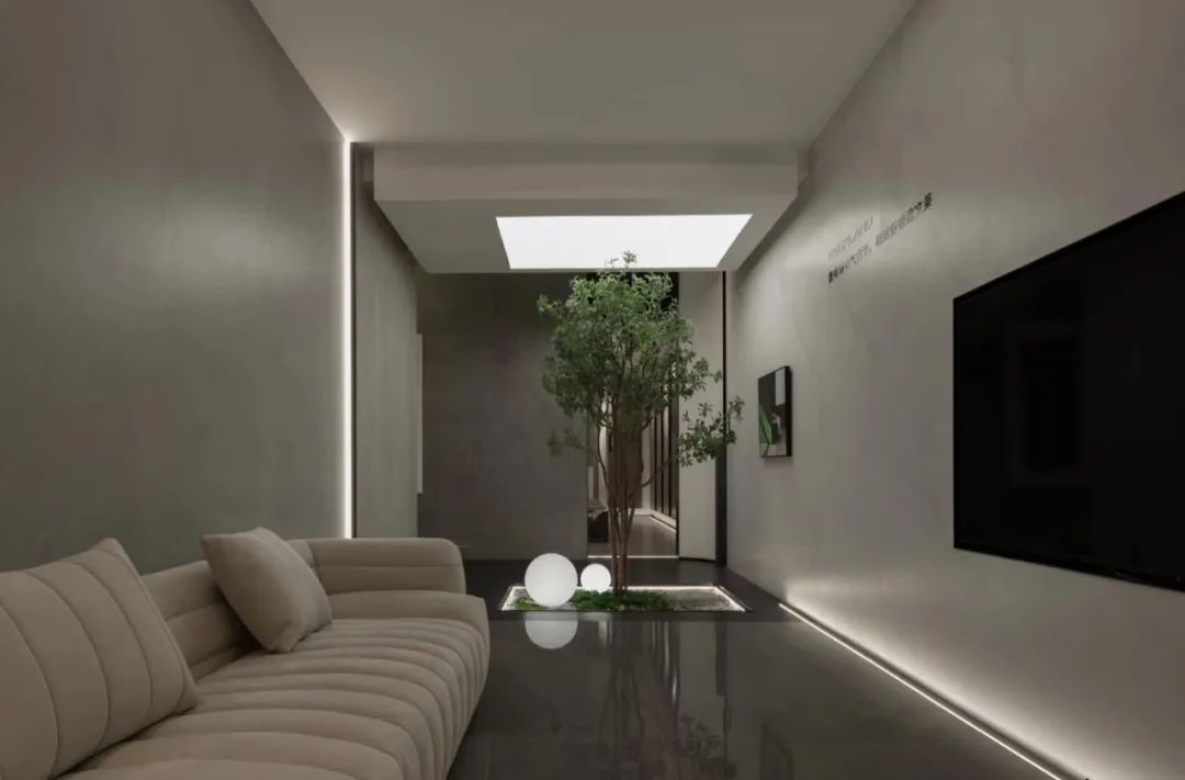 从灯饰的选择到小客厅的绿植景观,温和宁静,一字型琴键沙发,轻松舒适,以简约的装饰烘托恬静宜居氛围,更以大面积的简约铺贴呈现产品工艺细节。