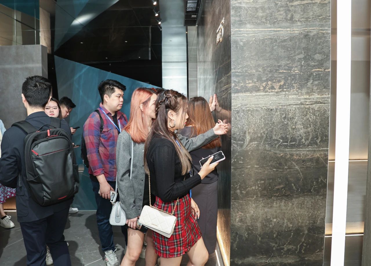 ▽ 来自俄罗斯、韩国、马来西亚、印度尼西亚等国家留学生代表组成的参访团,在欧文莱公司品牌营销中心策划总监文映人的陪同下参观了解欧文莱素色美学馆。