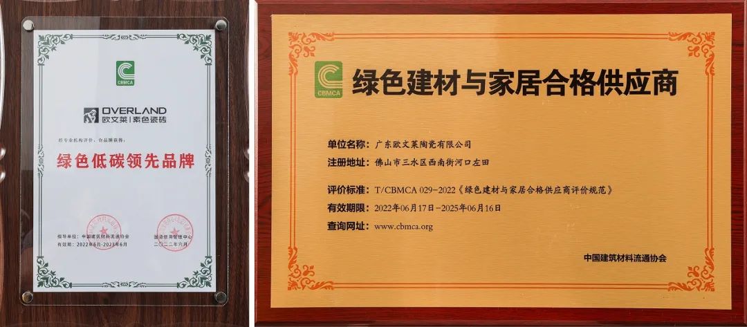 .欧文莱获颁“绿色低碳领先品牌”、“绿色建材合格供应商”并入选第一批“绿色建材下乡推荐品牌”。