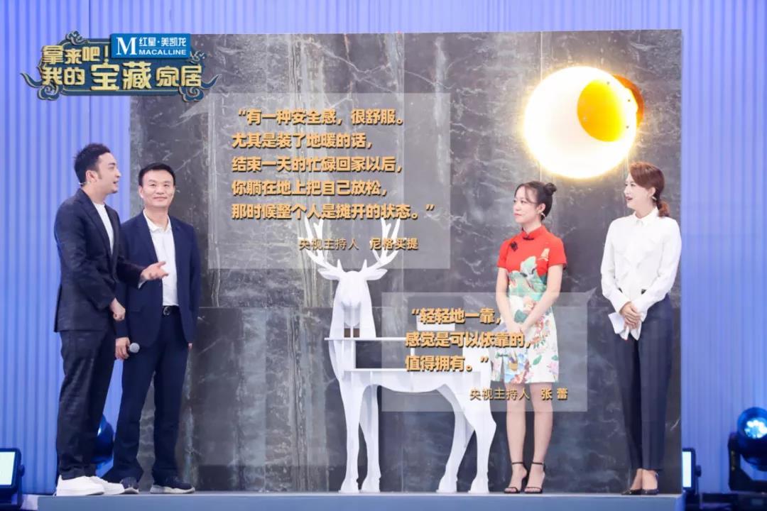 9月17日20时,在央视演播大厅,央视著名主持人尼格买提、张蕾、文化大师杨阳现身《拿来吧!我的宝藏家居》专场直播,与红星美凯龙执行总裁朱家桂、红星美凯龙总裁兼装修产业集团CEO谢坚联合一众品牌BOSS天团一起开启直播带货。