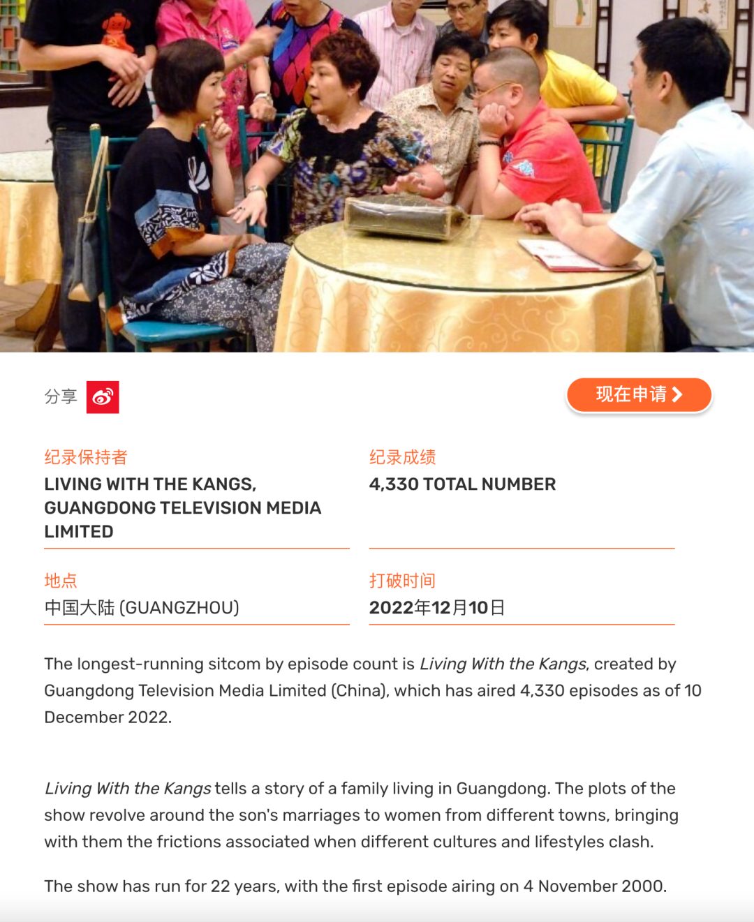 ▽ 《外来媳妇本地郎》是由广东广播电视台摄制出品、以粤语为主要语言的当代家庭生活题材电视系列短剧。从2000年开播至今,该剧早已成为中国广电史上播出时间最久、播出集数最多的电视剧作品,更在今年7月公布获吉尼斯世界纪录官方认证,成为世界上播出时间最长、集数最多的情景喜剧,展现了中国情景喜剧人的创作恒心和毅力,以及该剧的观众、市场认可度。
