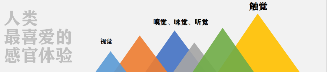 在对人类喜欢的感官体验的调查研究中,我们发现人类对视觉的反馈是最外层的,嗅觉、味觉、听觉在中间层,而对于触感的刺激愉悦度是最为深度和敏感的。比如当我们闭上眼睛抚触到某些轻柔物件时,就会让人慢慢平静并且放松。这种现象是来自于人类婴儿期的成长体感记忆,当人从母体出来的时候,首先通过外界挤压触碰而形成第一感,就是触感,随之其他感官逐渐形成,而视觉是最后一种发育成熟的感知系统。