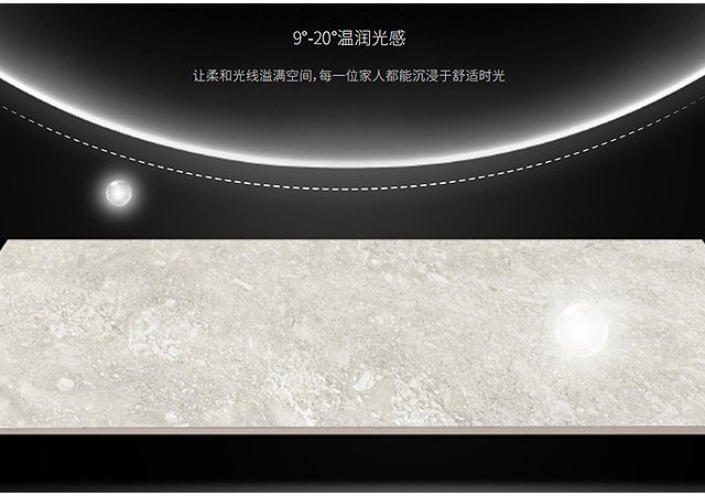 “高级灰4.0”系列的智能分光二代技术柔磨,就是模拟了手抚式的动作和力度,对瓷砖表面进行光感塑造,具有很好的生物舒适性,产品表面呈现9-20°的温润光感,让每位家人享受到一种舒适时光。