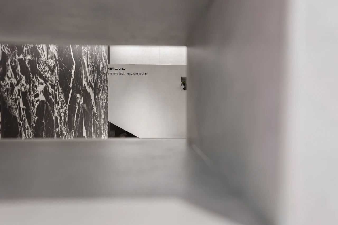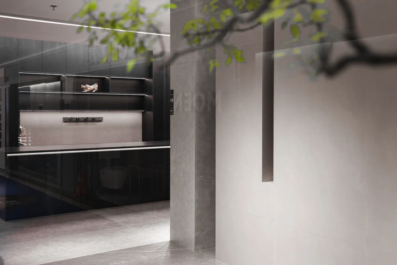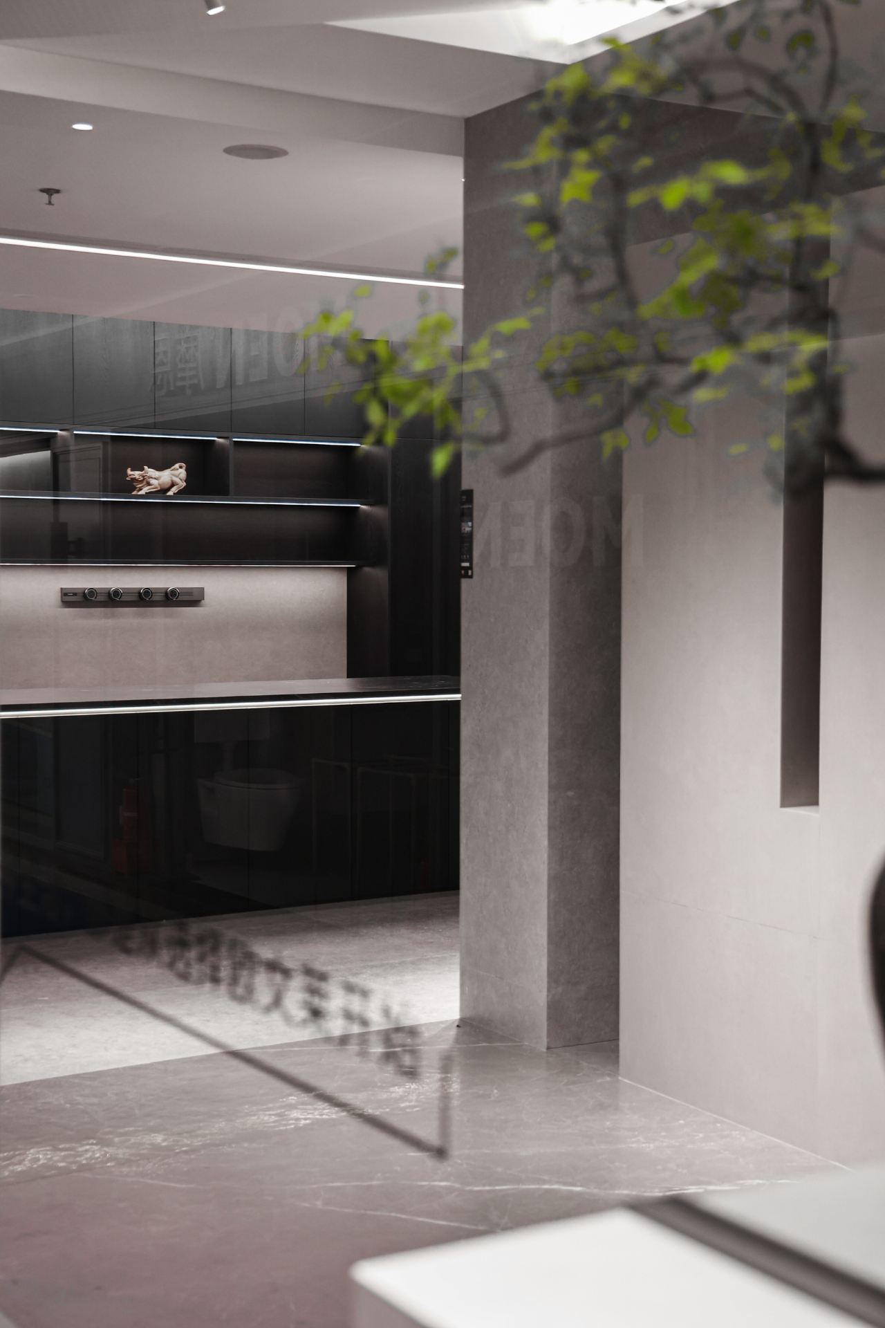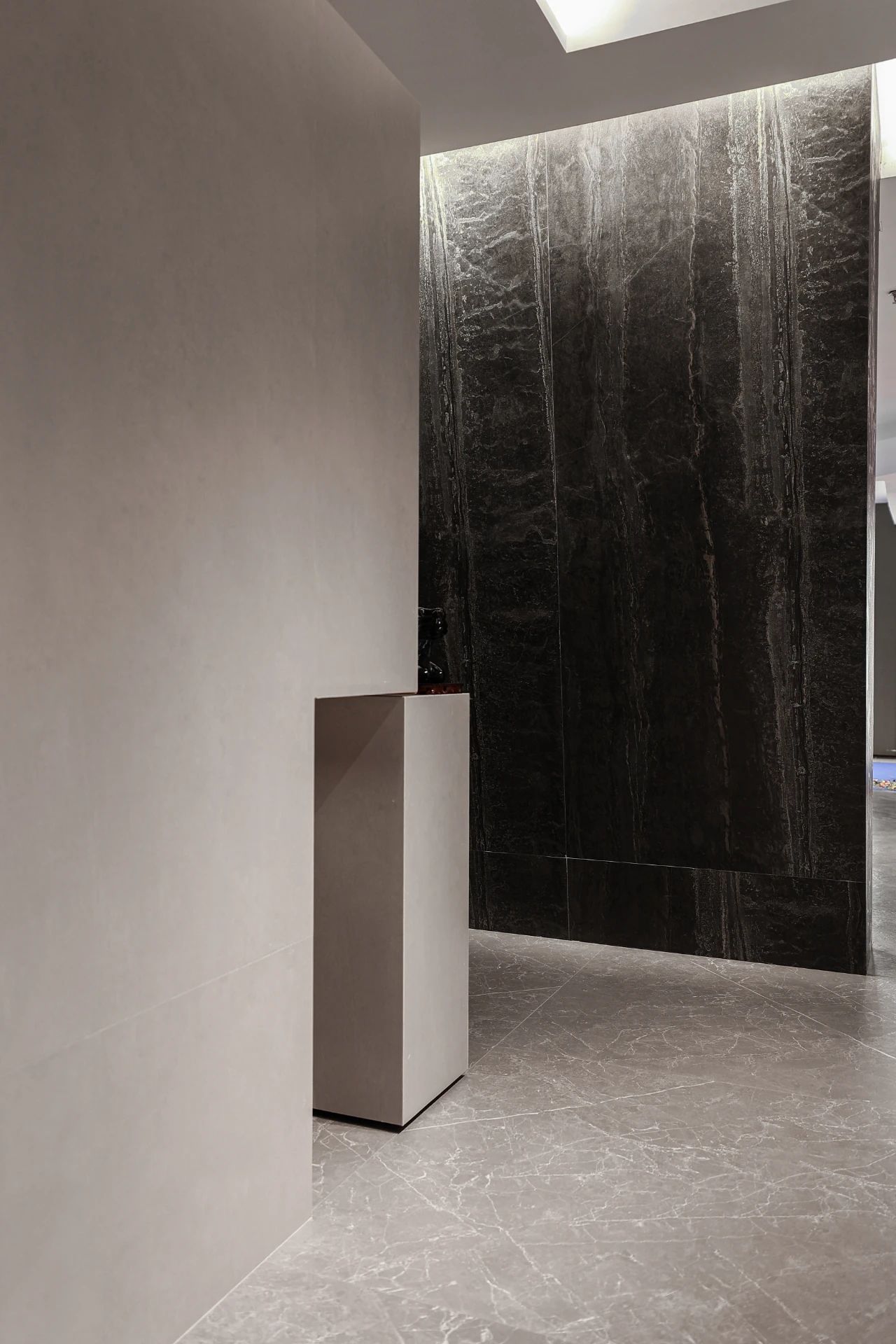 欧文莱厦门高级体验店美感的精髓,主要体现在用色克制,有温度的朴拙感。欧文莱的审美不被一时风向左右,在常年摸索中,偏爱在自然元素、时间痕迹、艺术人文中寻找灵感,形成自己的素色美学设计观,产品应高阶审美而生。新店从外立面到门厅部分皆紧密围绕第七代符号产品[时光盒子]系列展开,既有大面积铺陈的简约干净,亦有晕染自然的水墨画般艺术美感,营造出如艺术馆的空间张力。整个空间应用内建筑的手法,在不同切割、拼合的几何中,呈现出精致的线条感与强烈的空间感。通过丰富的设计细节,创造出功能与美感共融的视觉焦点。几何影壁、楼梯踏步、墙体凹槽……暗藏光源从一侧透出,成为空间中引人入胜的细节景致;在整个灯光系统的营造下,则是一气呵成的自然流淌,于无声处带来妥帖体验感。行走中放慢脚步,每一步都可感受移步换景的建筑空间艺术。从门厅、家居体验场景延伸至选材区,通过软装的排列布局营造出温馨的空间场域,可远观、可近赏。对理想主义者来说,装修是陷入一场对细节的锱铢必较,辛苦却值得。欧文莱精品岩板、素色瓷砖作为空间的主要材料,纹理素雅、光感柔和、触感舒适、内敛的高级感,运用到场景中,表现出质感满盈的视觉效果。