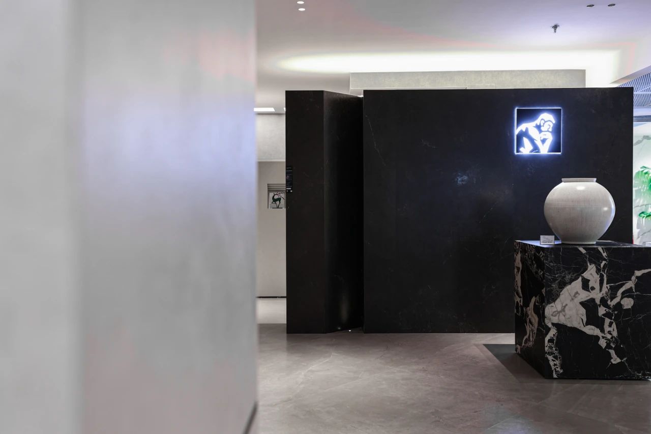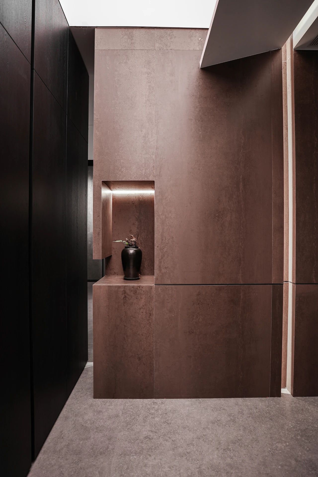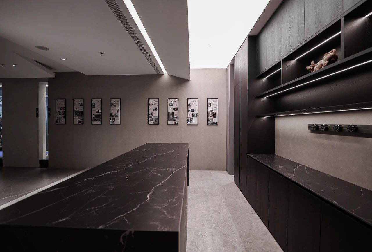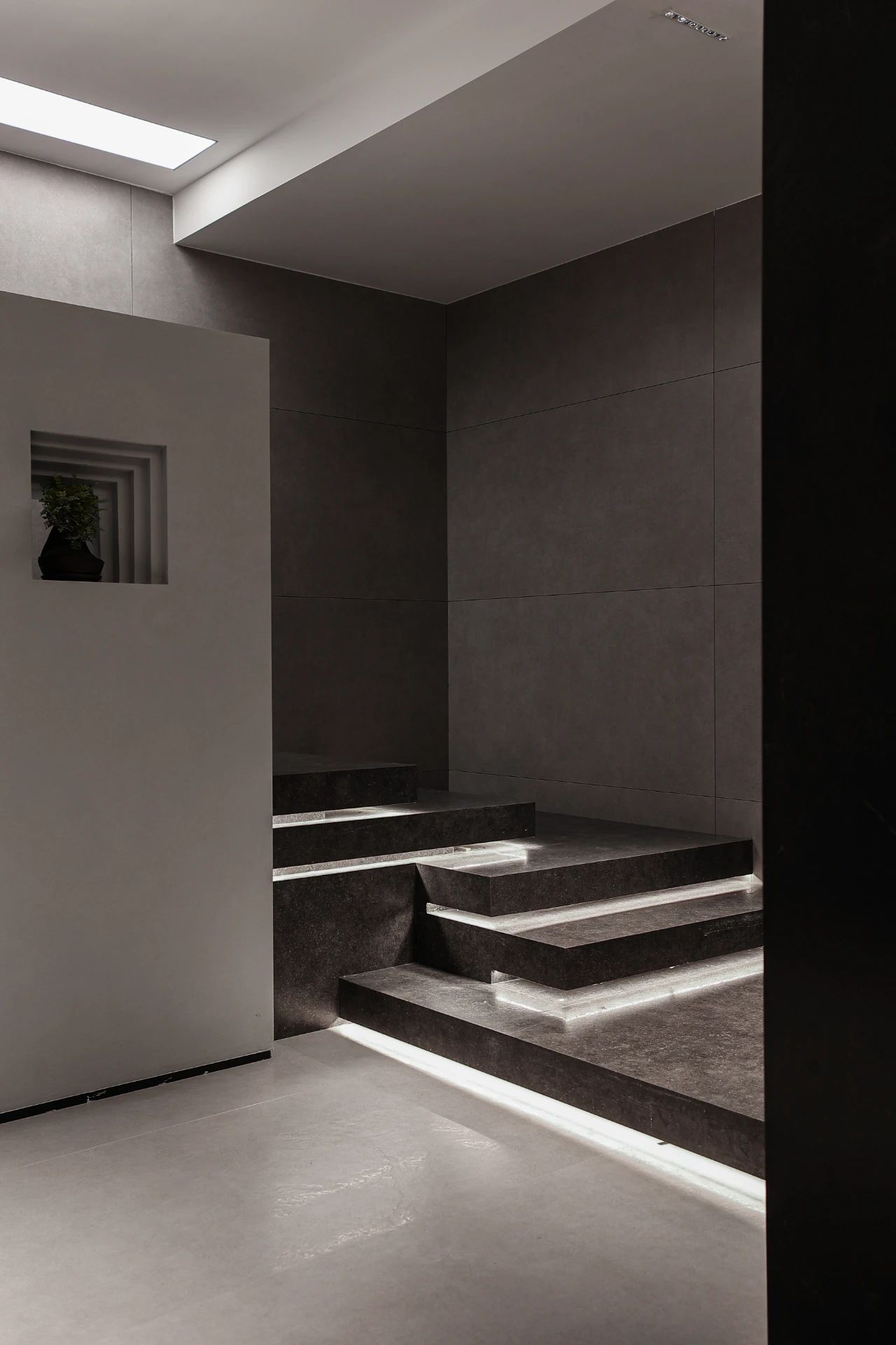 欧文莱厦门高级体验店美感的精髓,主要体现在用色克制,有温度的朴拙感。欧文莱的审美不被一时风向左右,在常年摸索中,偏爱在自然元素、时间痕迹、艺术人文中寻找灵感,形成自己的素色美学设计观,产品应高阶审美而生。新店从外立面到门厅部分皆紧密围绕第七代符号产品[时光盒子]系列展开,既有大面积铺陈的简约干净,亦有晕染自然的水墨画般艺术美感,营造出如艺术馆的空间张力。整个空间应用内建筑的手法,在不同切割、拼合的几何中,呈现出精致的线条感与强烈的空间感。通过丰富的设计细节,创造出功能与美感共融的视觉焦点。几何影壁、楼梯踏步、墙体凹槽……暗藏光源从一侧透出,成为空间中引人入胜的细节景致;在整个灯光系统的营造下,则是一气呵成的自然流淌,于无声处带来妥帖体验感。行走中放慢脚步,每一步都可感受移步换景的建筑空间艺术。从门厅、家居体验场景延伸至选材区,通过软装的排列布局营造出温馨的空间场域,可远观、可近赏。对理想主义者来说,装修是陷入一场对细节的锱铢必较,辛苦却值得。欧文莱精品岩板、素色瓷砖作为空间的主要材料,纹理素雅、光感柔和、触感舒适、内敛的高级感,运用到场景中,表现出质感满盈的视觉效果。