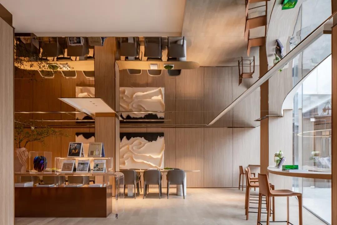 项目信息 INFORMATION 项目名称 / 保利招商锦上花园 项目地址 / 广东东莞 项目设计 / 尚诺柏纳空间策划 设计面积 / 1450㎡ 项目用砖 / 哈瓦那系列 本案以“日初、夕落、月升”为线索,串联了自然万物的美,从白昼光芒初生,到正午阳光正盛,再到傍晚惬意随性的淡淡光芒……光影虚实交织,在空间演绎从白昼到黑夜的都市节奏,亦表达了对都市生活之美的歌颂。 哈瓦那系列主要为售楼中心地面用材,哈瓦那原石外放大气的纹理,融入高级灰,营造沉稳大方的空间氛围,有大海的力量感,彰显情怀和格局。在日升日落的缱绻光影下,将空间质感映照其中,带来戏剧性的美观效果。 01. SUNRISE 日光初现 一年之际在于春,一日之际在于晨。随着第一束光的降临,新的一天拉开了序幕。 缓缓步入前厅,开敞宏阔的空间映入眼帘。如日光初现,晨露落于水面泛起涟漪,层层荡漾,以亚克力的材质定格于此,让空间颇具动感,引人入胜。