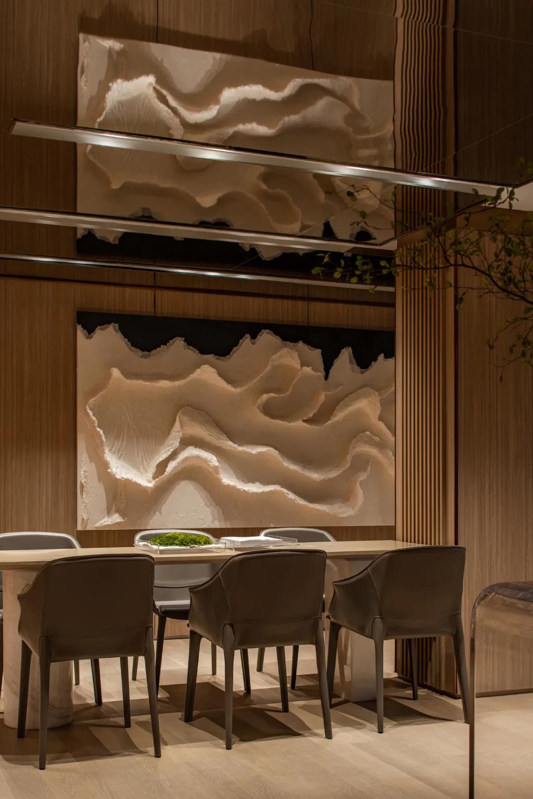 展厅内部动线明晰,看似随意却饱含精心规划的流动线,让人流连忘返于其中。几面曲直各异的格栅屏风,若隐若现中捕捉着光影,穿行其间增添了几分神秘感。 步入沙盘区,便是进入到空间光亮最盛的区间,使得视觉上更加开敞。
