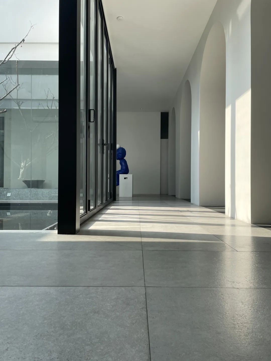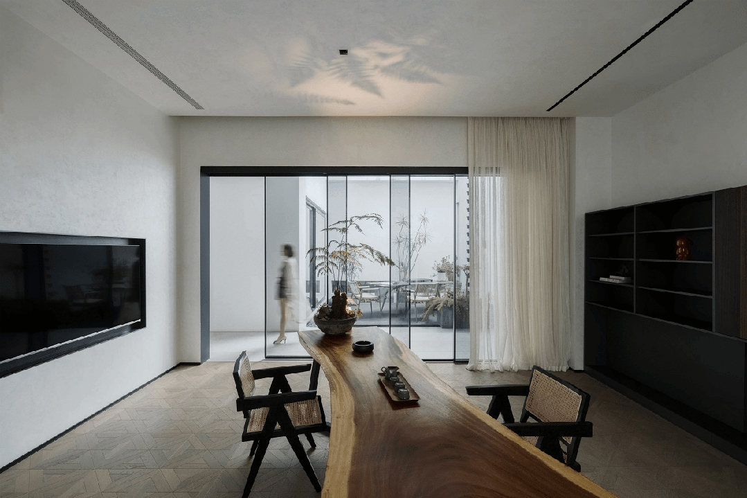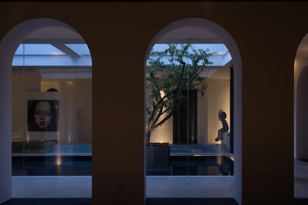 与很多公司传统的进门设计不同,整个空间的设计是随性的,去前台化的,没有太多的条条框框,让思路自然打开。设计师表示,首先穿过画廊,抵达区间前的路途,采用了先抑后扬的手法。这样一个相对安静的空间,是经由身体至心理的前奏铺垫,在过程中去欣赏和了解新成对设计的理解,然后穿透到一个打开的状态,豁然开朗,像桃花源记一样。陶渊明的《桃花源记》,借武陵渔人行踪这一线索,把现实和理想境界联系起来,为世人创造了一个世外桃源的想象。芳草鲜美,落英缤纷,阡陌交通,鸡犬相闻。快节奏的现代社会生活,每个人都急匆匆的在往前奔忙,驻足美景、流连趣事越来越成为人们生活里不可或缺的精神养分。时至今日,桃花源的意义不只是一个标签性很强的概念、一个理想化的图腾,寻找桃花源,寻找的,是在快节奏生活状态下,一个暂得喘息的理想出口,是理想生活的肇始与初心。一缕清风,几片闲云,还有绿植散发出的大自然清冽悠香,颇有一种“久在樊笼里,复得返自然”的豁然。沿着廊道向前走,艺术画作的设置让空间处于一种悬浮状态,既简单又不呆板,一些盒子状的穿插结构,拾级而上,感觉更灵活灵动。视线中的艺术楼梯,拾级而上,则可抵达二层的园林。存在于整个空间当中,它像一件艺术品,亦给人以上下的尺度感。铺设廊道的是欧文莱“灰印象”系列瓷砖(点击跳转介绍),在光线映衬下展现出丰富的层次感和自然肌纹,化繁为简,以刚驭柔,为整个场所平添几分气度与生命力度。“灰印象”还原自然石材的质感状态,肌肤与砖之间的温润度,更好还原设计理念的简约肌理,亦成为了它被青睐与选择的原因。“素色能融入到整个空间里面来,能更好地表达设计作品本身,而不是砖本身。我们选择材质的时候用的是基本是素色和木色,因为想让自然的东西带到我们的生活中来。欧文莱的素色砖的特点就是质感非常好,和大自然能融为一体,给人以包容感。”“我们选择的砖以及设计空间的所有材质,它们未来都是一个整体,而不是某一个单独的东西跳脱出来,它不应该这样传递。‘灰印象’表面凹凸的小肌理,像极了雨后小路,它更好地把外面的水景和自然融合到了一起。”夕阳渐昏的光线将整个空间包裹,华灯初上,氛围阔朗而静谧。“好的设计没有太多的形式化,欧文莱(素色砖)的灰度可以让我们在不同空间,不同场景去表达不同的光感感受,阴影感受,以及光和空间怎么做一个更好的结合,生动的状态。”四边廊道围合出一方天地,设计师将中国传统四合院和古罗马斗兽场拱形元素等西化造型相结合,希望达到一种巧妙的衔接,产生一种东西方的融合之美。放眼可见,中古的金箔屏风、经典的昌迪加尔椅、当代的极简柜体等不同时期的元素进行和谐对话,具有人文色彩的素色瓷砖、时尚感的大理石及玻璃材质、石竹等元素的混搭,通过光线调教,构筑属于现代人的意象之居。作为接待室的空间,也作为平时朋友相聚的场所,融入了设计师对生活方式的理解。参考中国的四水归堂设计理念,空间布置得紧凑,而又自然连通。各个空间各具艺术感染力,在花叶漫漫中自成焦点,却又与周遭一切脉韵连贯,相得益彰。四季草木,郁郁葱葱,仿佛信手拈来的诗情画意,却对空间进行了巧妙而合理地划分,保证各部分独立性的同时去除疏离与突兀,使空间叙事具有连贯性及整体性。设计师希望,一切都是回归到自然里面的。整个空间材质以素色、木色为主色调,以框景手法,将自然之景引入空间之中,虚实结合,移步换景,借景造景,将室外和室内形成无缝的链接,营造一种回味悠长的意境之美。都市喧嚣隐匿在桃花源般的宁静和美中,此情此景,人与空间情感交融。啜饮谈天,偷得浮生半日闲,这是一种温和的、潜移默化的促成。每个区间有各自不同的尺度和性格,但殊途同归,可见的是设计师对空间设计的理解,以及在人文生活情境上的打磨。新成空间艺术成立于2007年,是一家专注于高端私宅设计研究与实践的事务所,致力于引领东方现代居住审美,平衡精致的美感与生活方式的魅力,提倡无风格设计。通过研究空间与人的关系与感受,构建当下人对空间的物质与精神的感受。