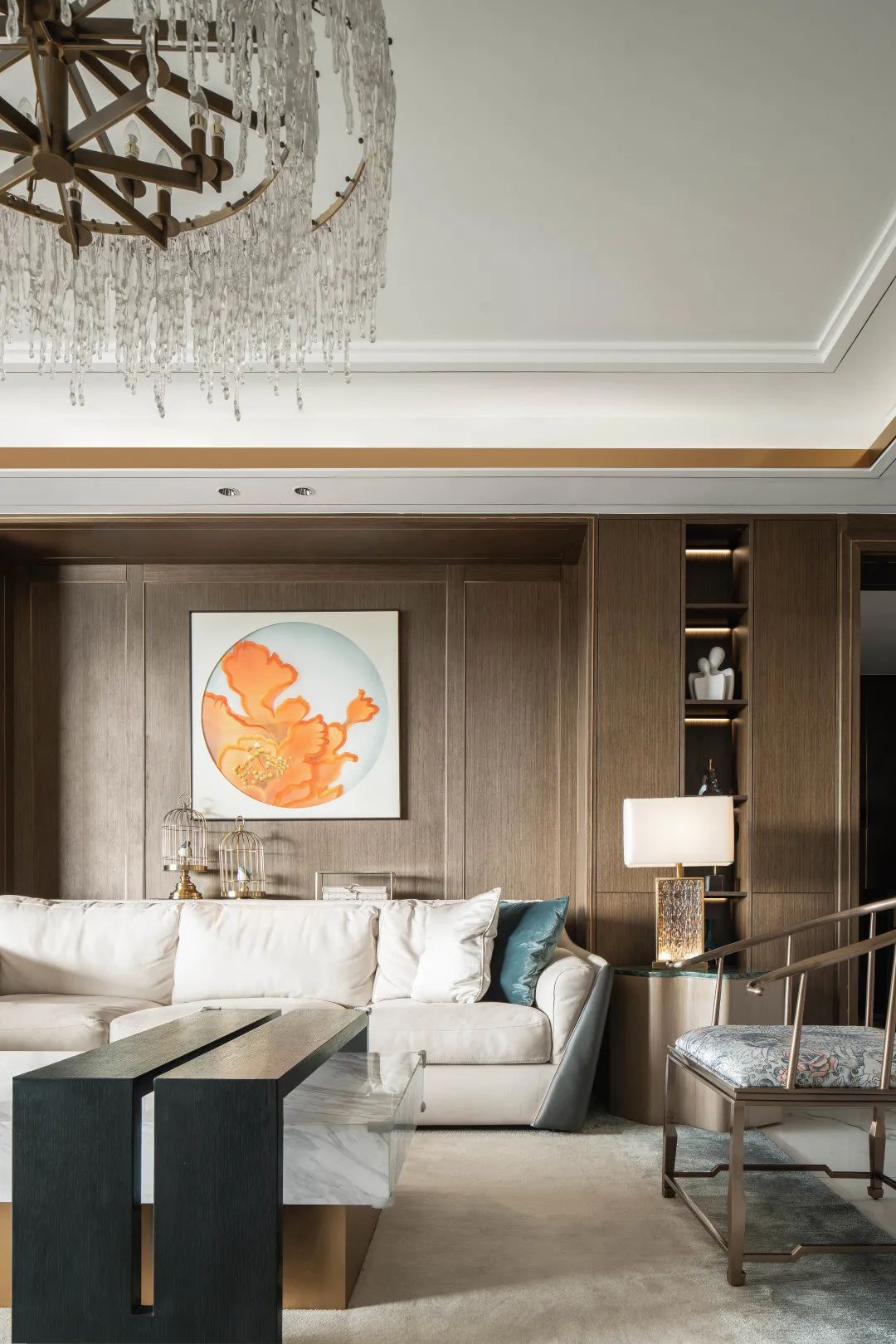 客厅整体以素雅的白色、木色为主,沙发背景墙以深木色增加整体空间的分量感,古典雅致的意蕴就此渲染开来,墙面中间盛放的牡丹花,热烈恣意,成为整间客厅最亮眼的焦点。