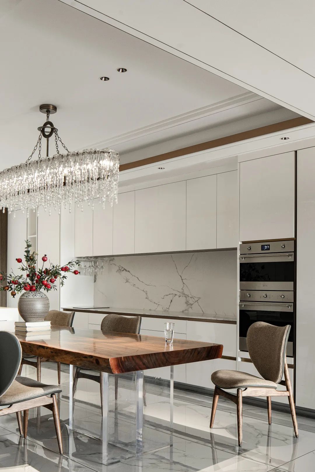 椭圆形水晶灯悬于中空,一侧是水墨晕染的山水画卷,一侧是现代简约的餐厨台,俩俩相望融于一体。