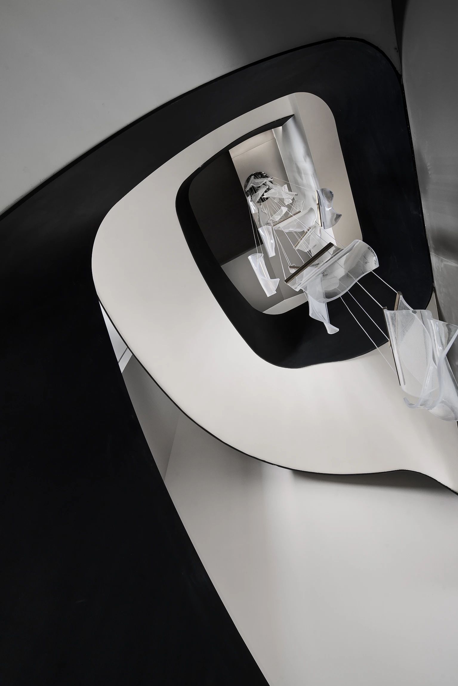 楼梯作为贯穿上下层的载体,在这里具有相当的艺术性和功能性,张扬大气的理石纹理打破极简黑白的沉闷,游龙般的蜿蜒简洁而不失优雅。视角随上下行进而转换,不同角度皆有趣味之美。