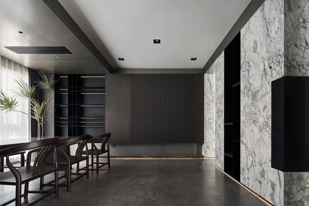 沉稳而内敛的视觉观感散布于每一个细节之中,墙、地不同的理石纹理赋予空间些许流动感,赋予空间感染力。