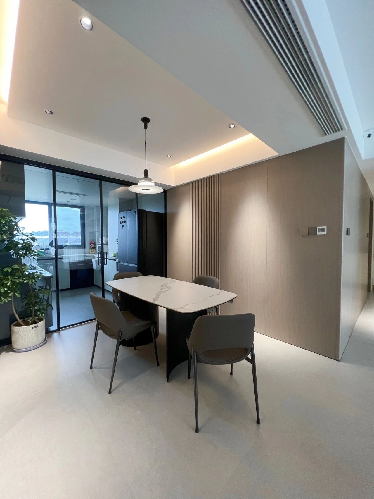 客餐厅空间呼应一体化设计,并无明显的空间结构区分。在此基础上更多的是在家具尺寸布局上下更多的心思,在布局上将客餐厅区域进行软分割,在使用上又互相连贯。