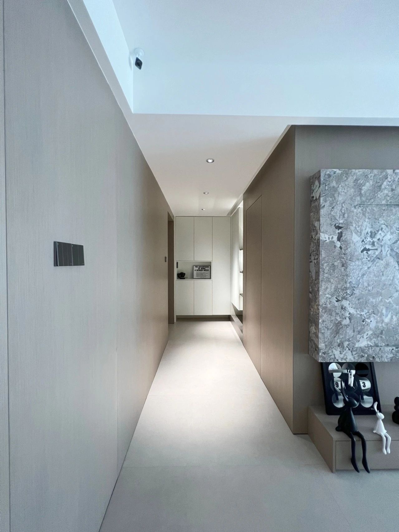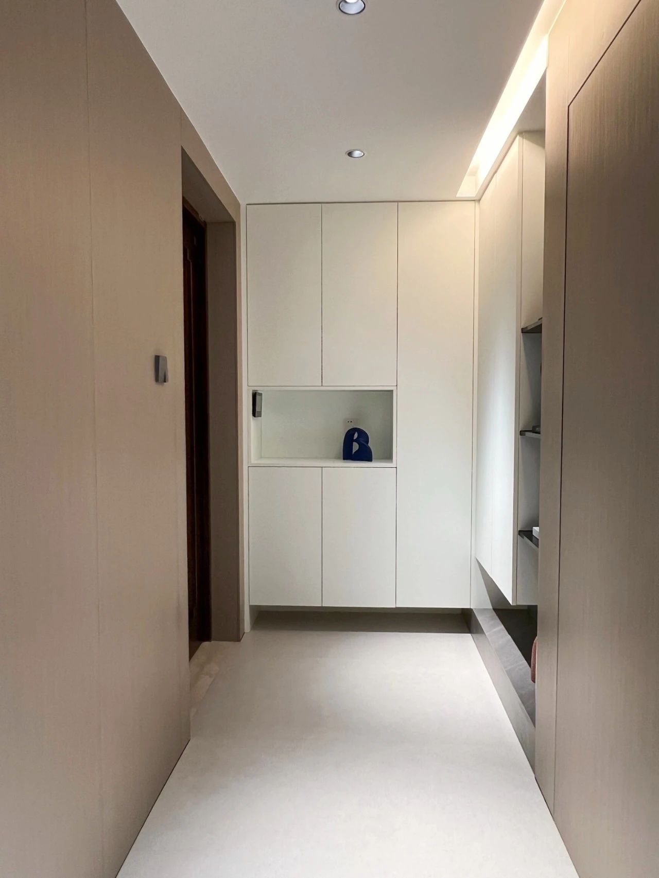 进门处增加独立玄关区域,为鞋履、包包找到了“栖身”之地,满足入户收纳功能,同时加入壁灯点光源为玄关区域增添氛围感。